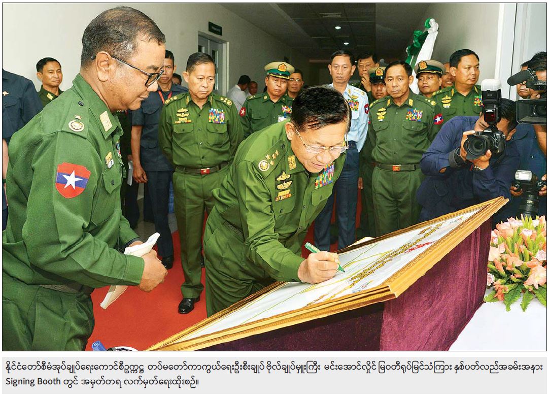 ဆက်လက်၍ နိုင်ငံတော်စီမံအုပ်ချုပ်ရေးကောင်စီဥက္ကဋ္ဌ တပ်မတော်ကာကွယ်ရေးဦးစီးချုပ်နှင့် အခမ်းအနားတက်ရောက်လာကြသူများသည် မြဝတီရုပ်မြင်သံကြားနှစ်ပတ်လည်အခမ်းအနား Signing Booth တွင် အမှတ်တရလက်မှတ်ရေးထိုးသည်။