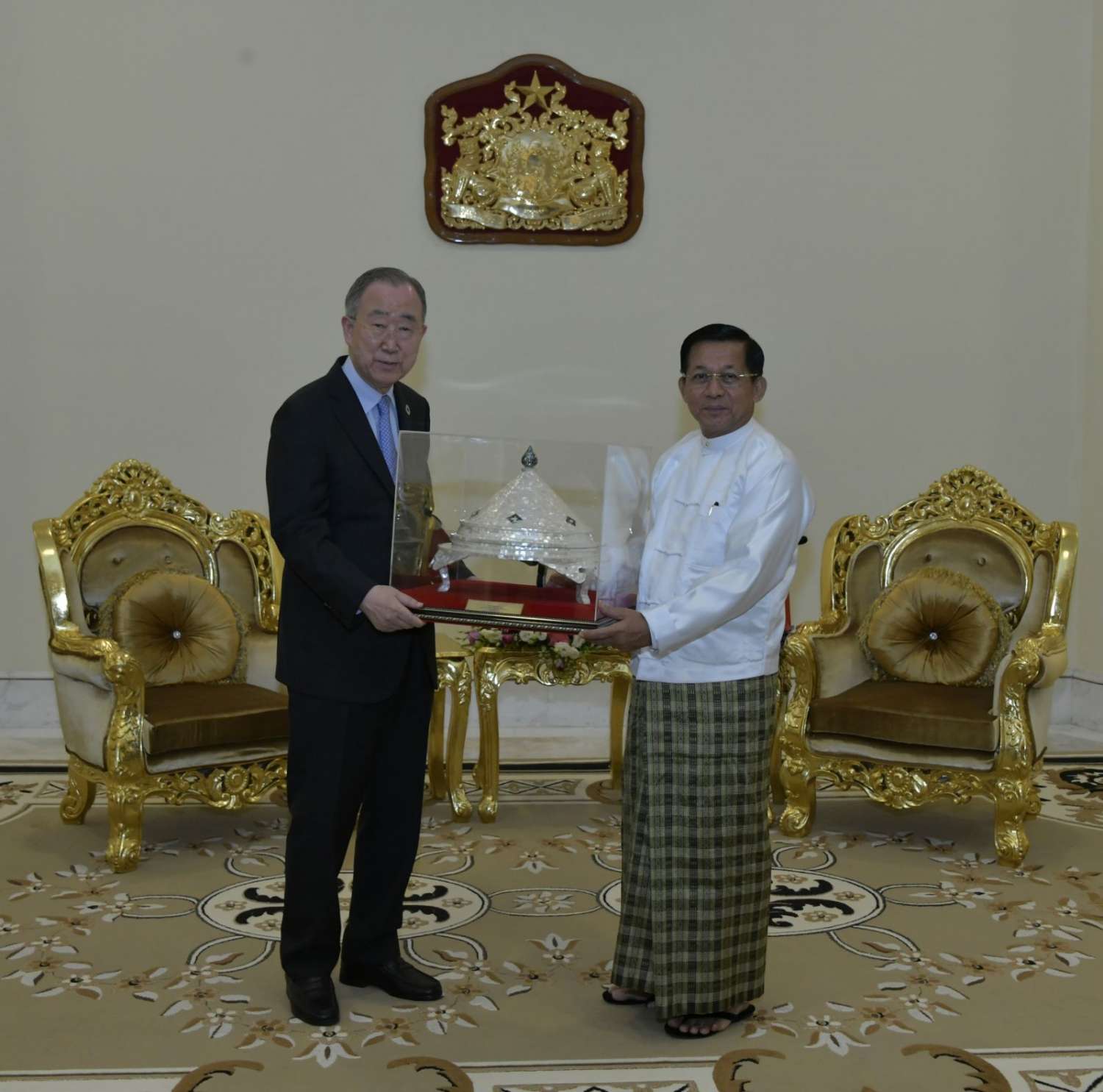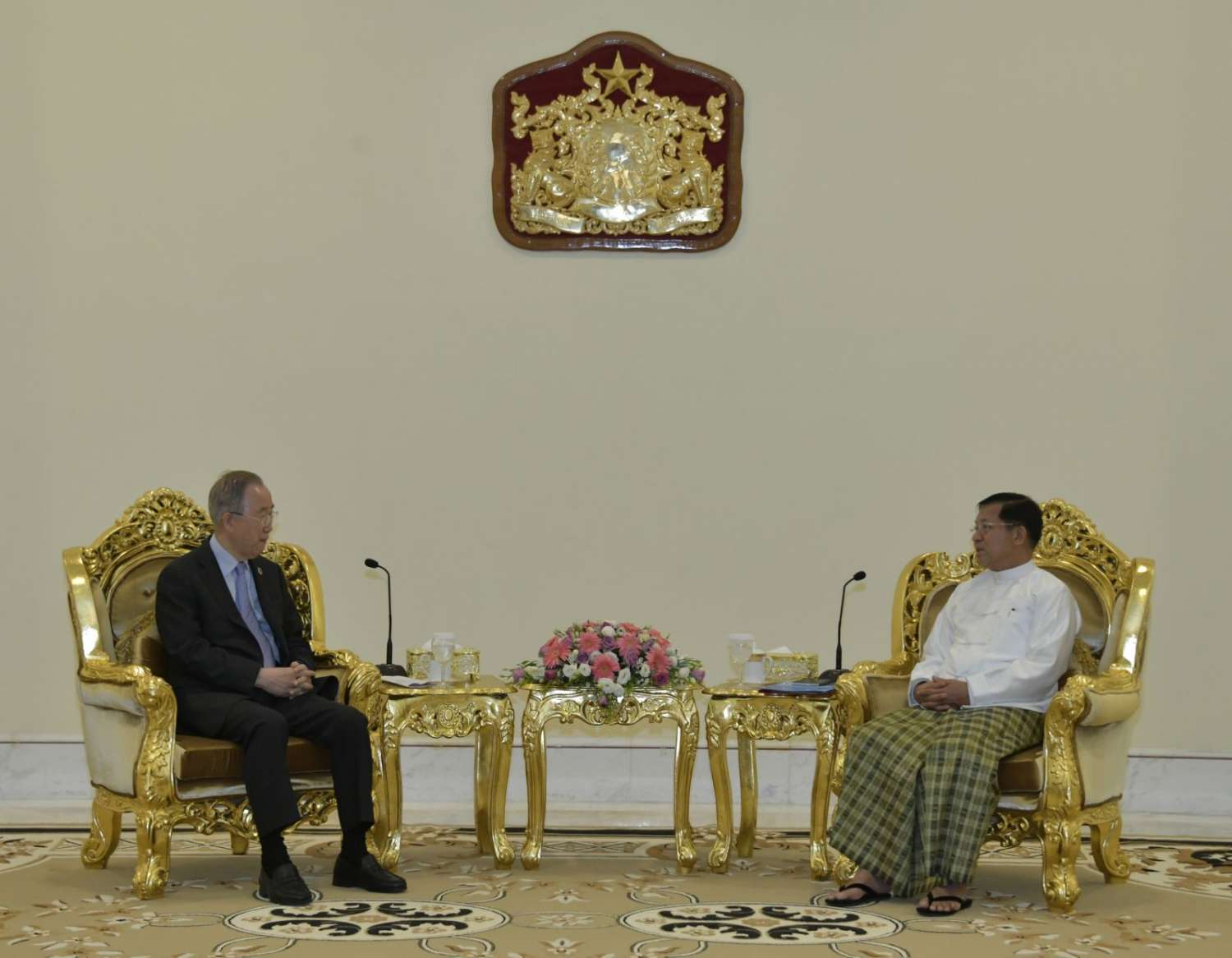 နိုင်ငံတော်စီမံအုပ်ချုပ်ရေးကောင်စီဥက္ကဋ္ဌ နိုင်ငံတော်ဝန်ကြီးချုပ် ဗိုလ်ချုပ်မှူးကြီးမင်းအောင်လှိုင်သည် The Elders အဖွဲ့ ဒုတိယဥက္ကဋ္ဌ၊ ကုလသမဂ္ဂအတွင်းရေးမှူးချုပ်ဟောင်း မစ္စတာဘန်ကီမွန်းအား ယနေ့နံနက်ပိုင်းတွင် နေပြည်တော်ရှိ နိုင်ငံတော်စီမံအုပ်ချုပ်ရေးကောင်စီဥက္ကဋ္ဌရုံး၊ ဧည့်ခန်းမ၌ လက်ခံတွေ့ဆုံသည်။