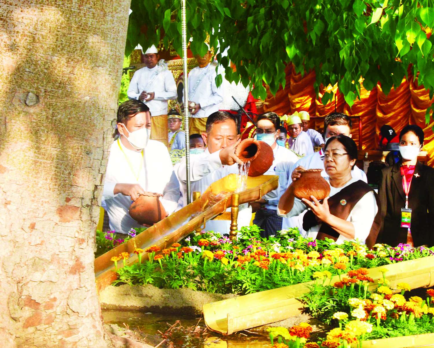 ဗုဒ္ဓဘာသာမြန်မာလူမျိုးတို့၏ ၁၂ လရာသီပွဲတော်တွင် တစ်ခုအပါအဝင်ဖြစ်သည့် မြန်မာသက္ကရာဇ် ၁၃၈၅ ခုနှစ်၊ ကဆုန်လပြည့်ဗုဒ္ဓနေ့ဖြစ်သော ယနေ့တွင်ကျရောက်သည့် ကဆုန်ညောင်ရေသွန်းပွဲတော်တွင် နေပြည်တော်၊ ဥပ္ပါတသန္တိစေတီတော်မြတ်ကြီး ပရိဝုဏ်တော် မြောက်ဘက်အရပ်ရှိ မဟာဗောဓိညောင်ပင်တော်များအား (၁၅)ကြိမ်မြောက် ကဆုန် ညောင်ရေသွန်းလောင်းပူဇော်ခြင်း မင်္ဂလာအခမ်းအနားကို ယနေ့ညနေပိုင်း၌ ကျင်းပပြုလုပ်ရာ နိုင်ငံတော်စီမံအုပ်ချုပ်ရေးကောင်စီဥက္ကဋ္ဌ နိုင်ငံတော်ဝန်ကြီးချုပ် ဗိုလ်ချုပ်မှူးကြီး မင်းအောင်လှိုင်နှင့် ဇနီးဒေါ်ကြူကြူလှတို့က မဟာဗောဓိညောင်ပင်တော်များကို ညောင်ရေသွန်းလောင်း ပူဇော်ကြသည်။