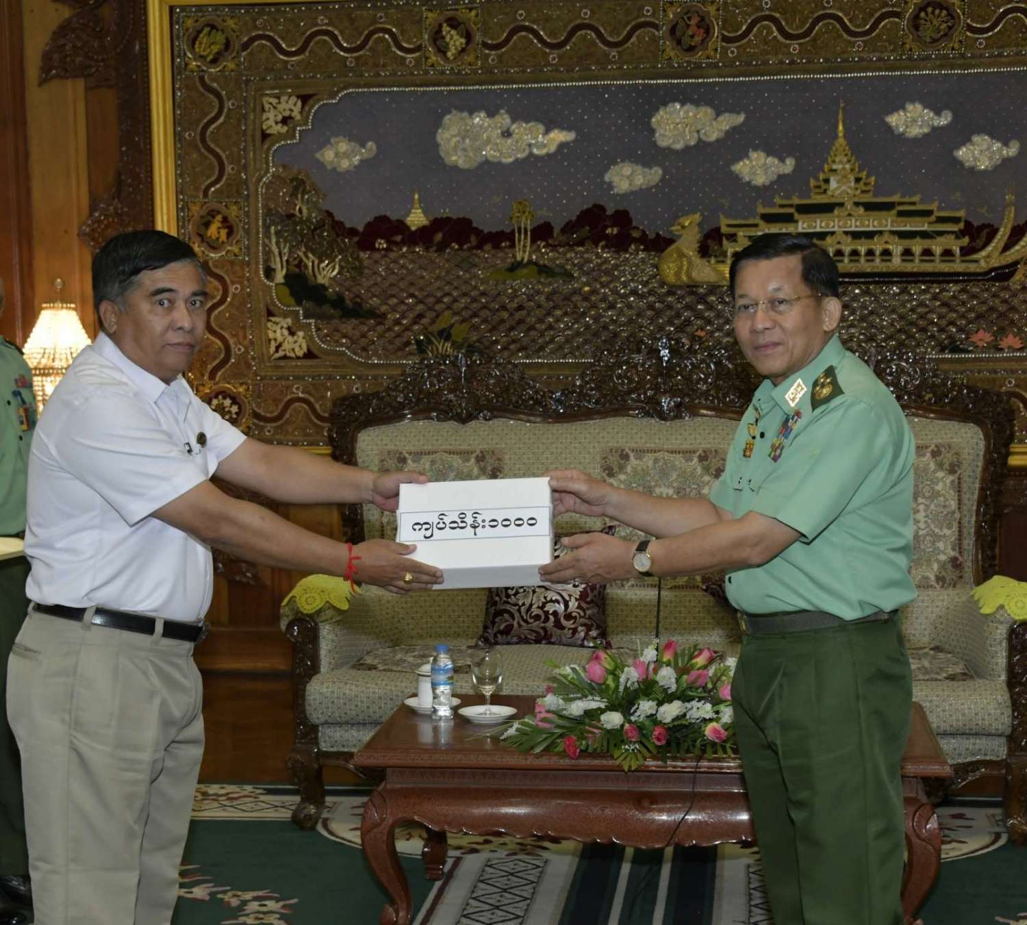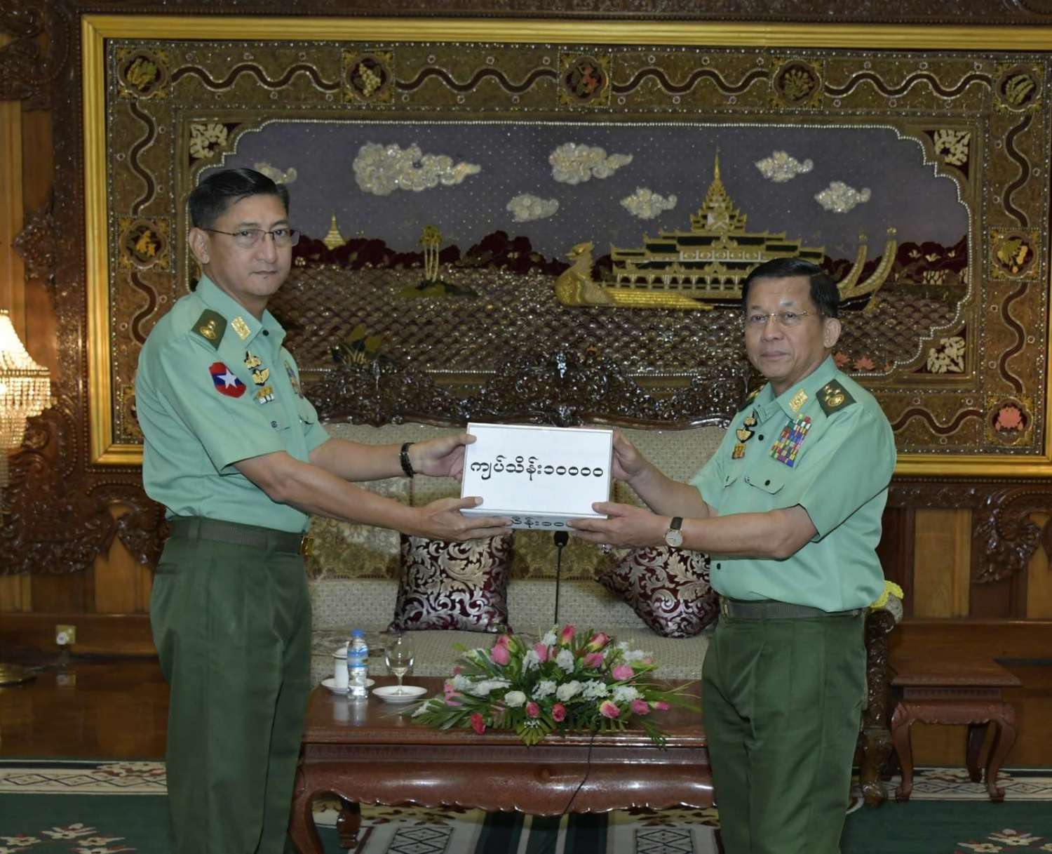 အားကောင်းသောဆိုင်ကလုန်းမုန်တိုင်း (Severe Cyclonic Storm) "မိုခါ" (MOCHA) ဝင်ရောက်မှုကြောင့် မုန်တိုင်းဒဏ်သင့်ခဲ့ရသည့်ဒေသများ၌ ကူညီကယ်ဆယ်ရေးနှင့် ပြန်လည်ထူထောင်ရေးလုပ်ငန်းများ ဆောင်ရွက်ရာတွင် အသုံးပြုနိုင်ရေး အလှူငွေများ ပေးအပ်လှူဒါန်းပွဲကို ယနေ့နံနက်ပိုင်းတွင် ရန်ကုန်တိုင်းစစ်ဌာနချုပ်၊ ကုန်းမြင့်သာရှိ ဇေယျာသီရိဗိမာန် ဧည့်ခန်းဆောင်၌ ကျင်းပပြုလုပ်ရာ နိုင်ငံတော်စီမံအုပ်ချုပ်ရေးကောင်စီဥက္ကဋ္ဌ နိုင်ငံတော်ဝန်ကြီးချုပ် ဗိုလ်ချုပ်မှူးကြီး မင်းအောင်လှိုင် တက်ရောက်သည်။
