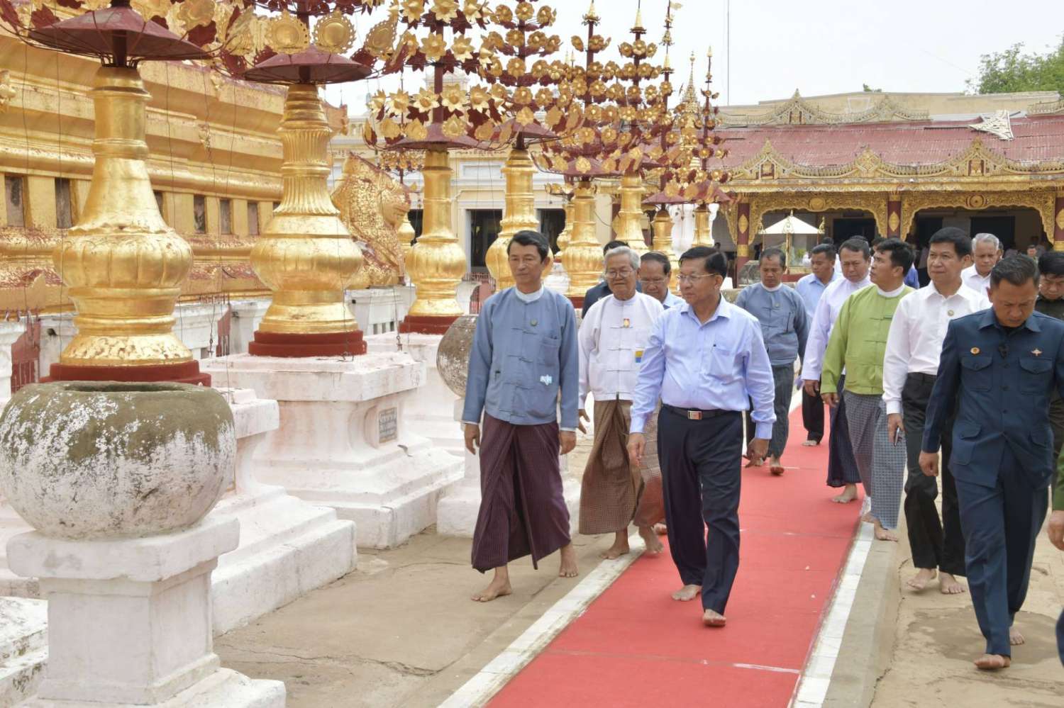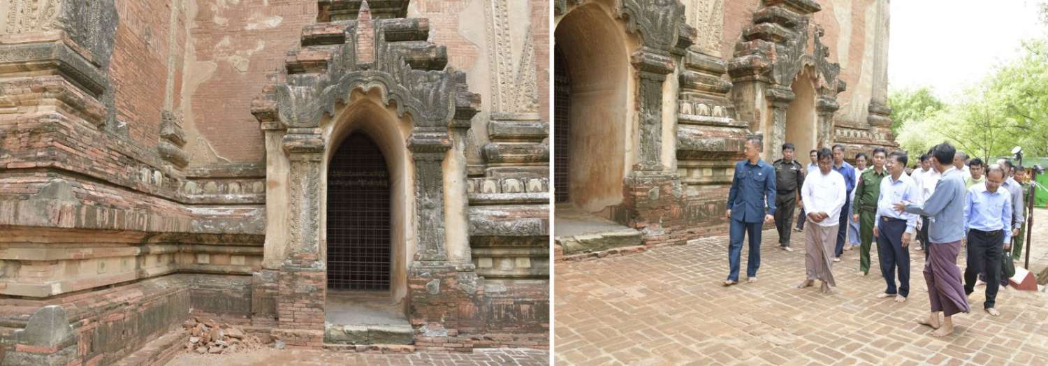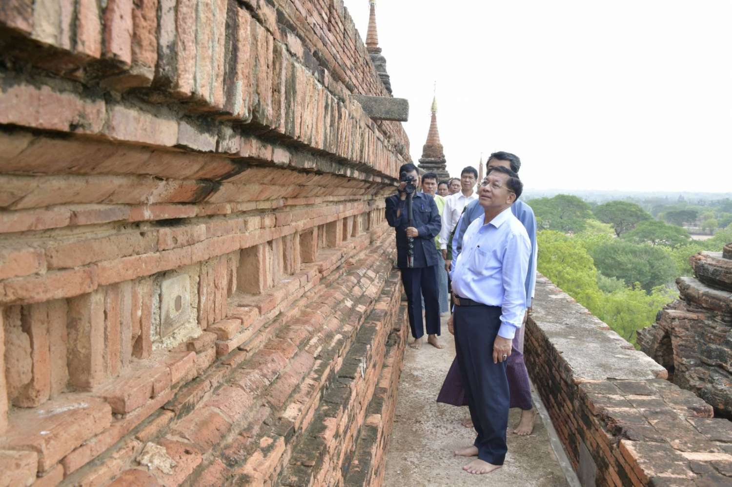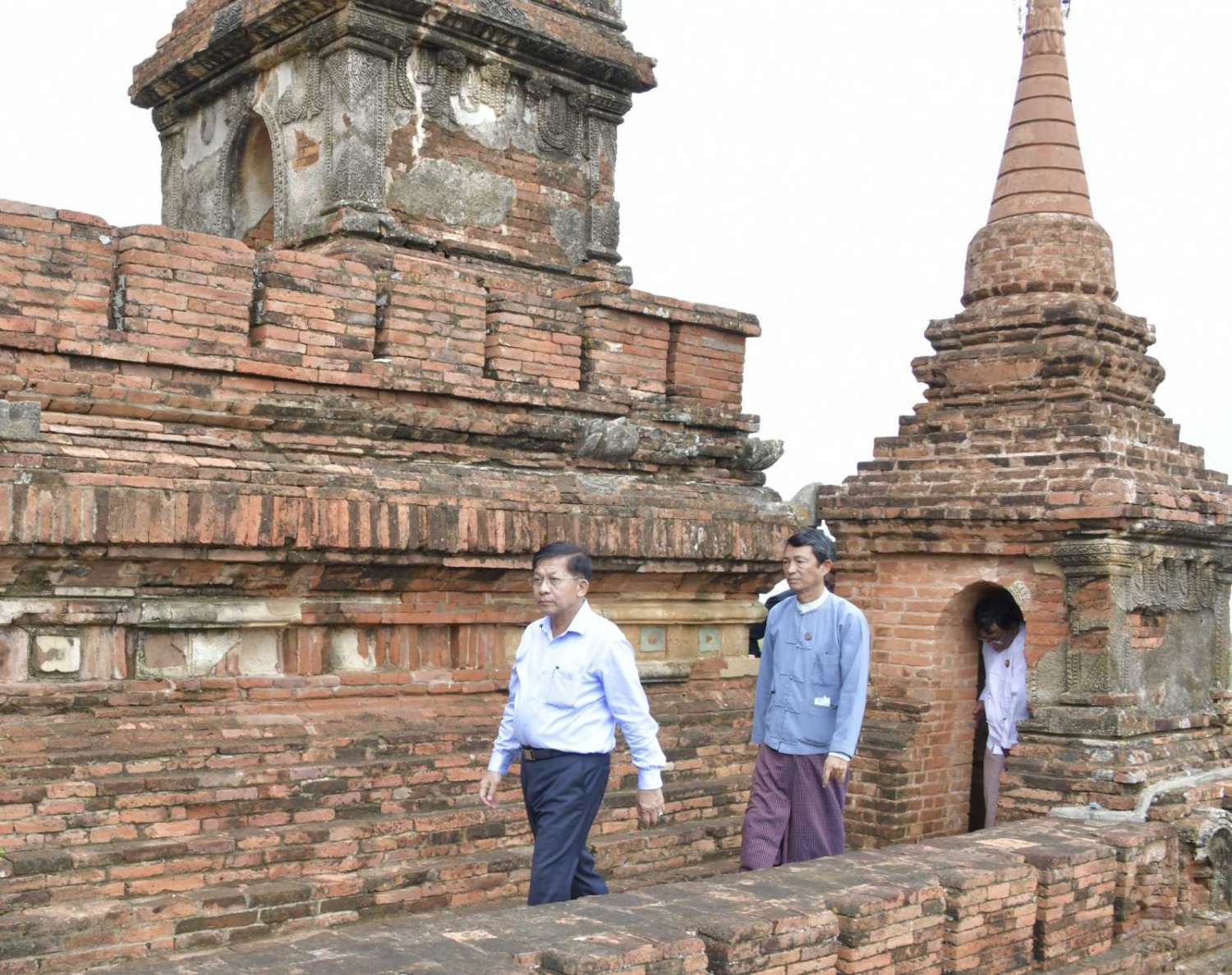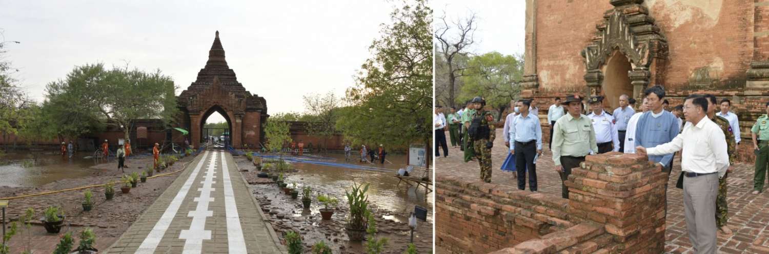 နိုင်ငံတော်စီမံအုပ်ချုပ်ရေးကောင်စီဥက္ကဋ္ဌ နိုင်ငံတော်ဝန်ကြီးချုပ် ဗိုလ်ချုပ်မှူးကြီး မင်းအောင်လှိုင်သည် မေ ၁၅ ရက်ညနေပိုင်းတွင် ဇနီးဒေါ်ကြူကြူလှ၊ ကောင်စီတွဲဖက် အတွင်းရေးမှူး ဒုတိယဗိုလ်ချုပ်ကြီး ရဲဝင်းဦးနှင့် ဇနီး၊ ခရီးစဉ်တွင် လိုက်ပါလာသည့် အဖွဲ့ဝင်များ လိုက်ပါ၍ သဘာဝဘေးအန္တရာယ်ဖြစ်ပေါ်မှုကြောင့် ရေဝင်၊ ရေဝပ်မှုနှင့် ထိခိုက်ပျက်စီးမှုများ ဖြစ်ပေါ်ခဲ့သည့် ပုဂံရှေးဟောင်းယဉ်ကျေးမှုနယ်မြေသို့ သွားရောက်ကြည့်ရှုပြီး လိုအပ်သည်များ လမ်းညွှန်မှာကြားသည်။