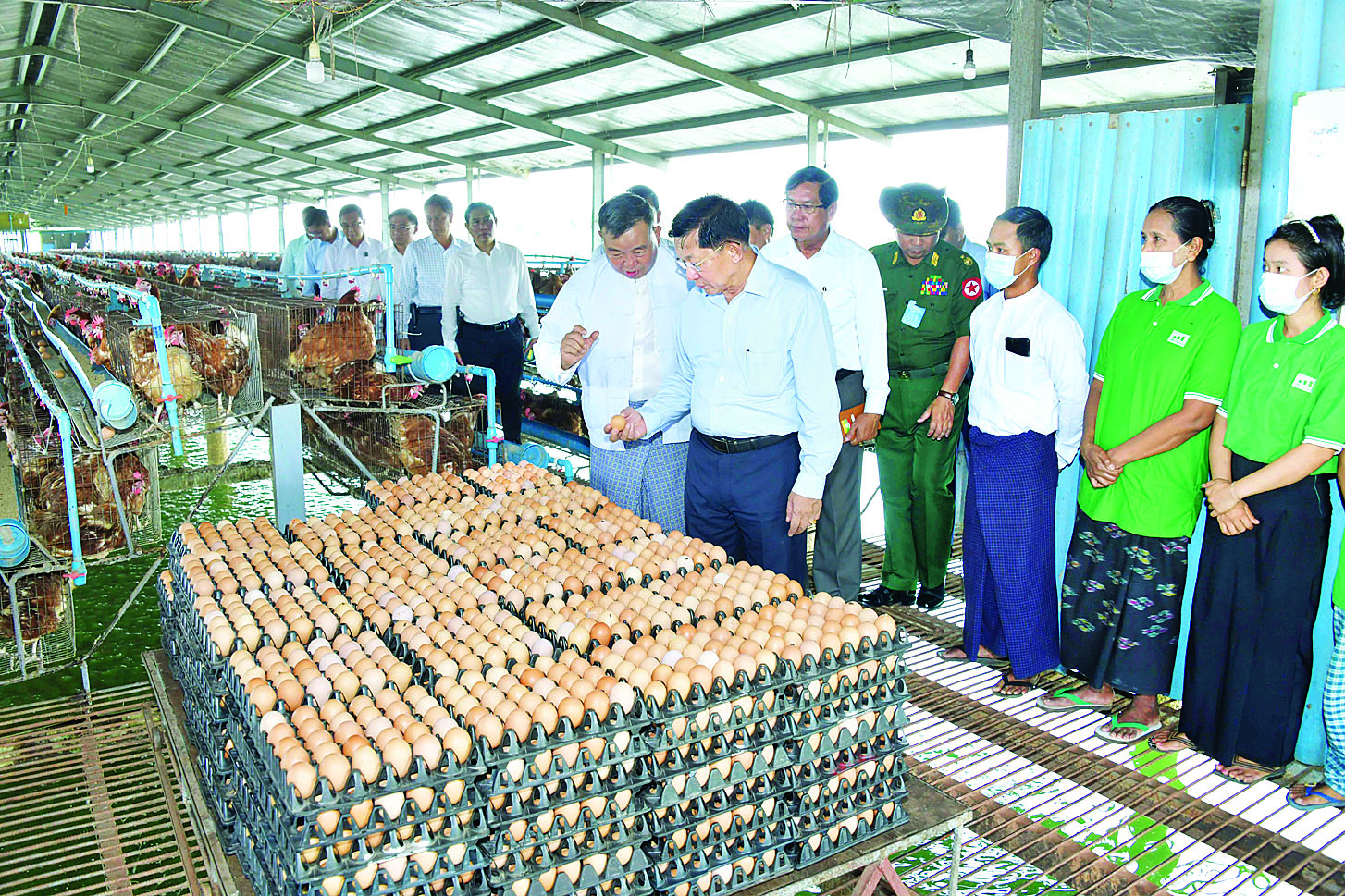 ယင်းနောက် နိုင်ငံတော်စီမံအုပ်ချုပ်ရေးကောင်စီဥက္ကဋ္ဌ နိုင်ငံတော်ဝန်ကြီးချုပ်နှင့်အဖွဲ့ ဝင်များသည် စိုက်ပျိုးမွေးမြူရေး ခြံအတွင်းဥစားကြက်များမွေးမြူ ထားရှိမှု၊ ငါးမွေးမြူထားရှိမှုနှင့် ဒူးရင်းပင်အပါအဝင် နှစ်ရှည်သီးနှံပင်များစိုက်ပျိုးထားရှိမှု အခြေအနေများကို လှည့်လည်ကြည့်ရှု ပြီးတာဝန်ရှိသူများ၏ တင်ပြချက်များအပေါ် သိရှိလိုသည်များမေးမြန်းပြီး လိုအပ်သည်များကို အကြံပြုဆွေးနွေးပြောကြား သည်။