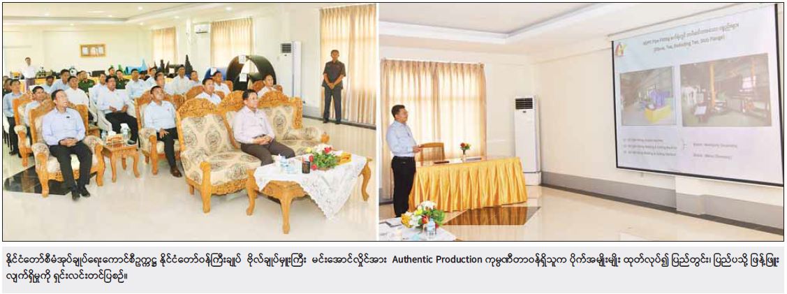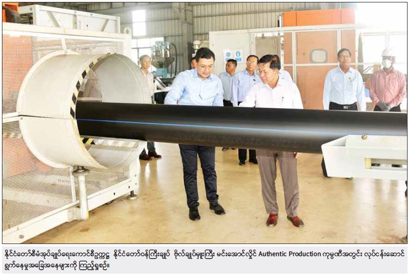 ဆက်လက်ပြီး နိုင်ငံတော်စီမံအုပ်ချုပ်ရေးကောင်စီဥက္ကဋ္ဌ နိုင်ငံတော်ဝန်ကြီးချုပ်နှင့် အဖွဲ့ဝင်များသည် ရန်ကုန်တိုင်းဒေသကြီး၊ မင်္ဂလာဒုံမြို့နယ်ရှိ Authentic Production Co.ltd သို့ ရောက်ရှိရာ ကုမ္ပဏီမှ မန်နေဂျင်းဒါရိုက်တာ ဦးအောင်မျိုးဟိန်းနှင့် တာဝန်ရှိသူများက ကြိုဆိုနှုတ်ဆက်ကြသည်။ ထို့နောက် ကုမ္ပဏီအစည်းအဝေးခန်းမတွင် ဦးအောင်မျိုးဟိန်းက ကုမ္ပဏီသမိုင်းအကျဉ်းနှင့် စက်ရုံမှ HDPE၊ DWC၊ PVC စသည့် ပိုက်မျိုးမျိုးကို ဆိုဒ်မျိုးစုံ ထုတ်လုပ်၍ ပြည်တွင်း၊ ပြည်ပသို့ဖြန့်ဖြူးလျက်ရှိမှု၊ ရေတိုင်ကီများ၊ မိလ္လာကန်များ၊ Road Block များ၊ ဟိုတယ်သုံး အညစ်အကြေးစစ်ထုတ်သည့် ပစ္စည်း၊ ပိုက်ဆက်ပစ္စည်းများကို ထုတ်လုပ်ဖြန့်ဖြူးလျက်ရှိမှု၊ ကုမ္ပဏီမှ ထုတ်လုပ်သည့် ပိုက်လိုင်းများကို စီမံကိန်းအသီးသီးတွင် အသုံးပြုလျက်ရှိမှုနှင့် ဆက်လက်ဆောင်ရွက်သွားမည့် အခြေအနေများကို ရှင်းလင်းတင်ပြသည်။