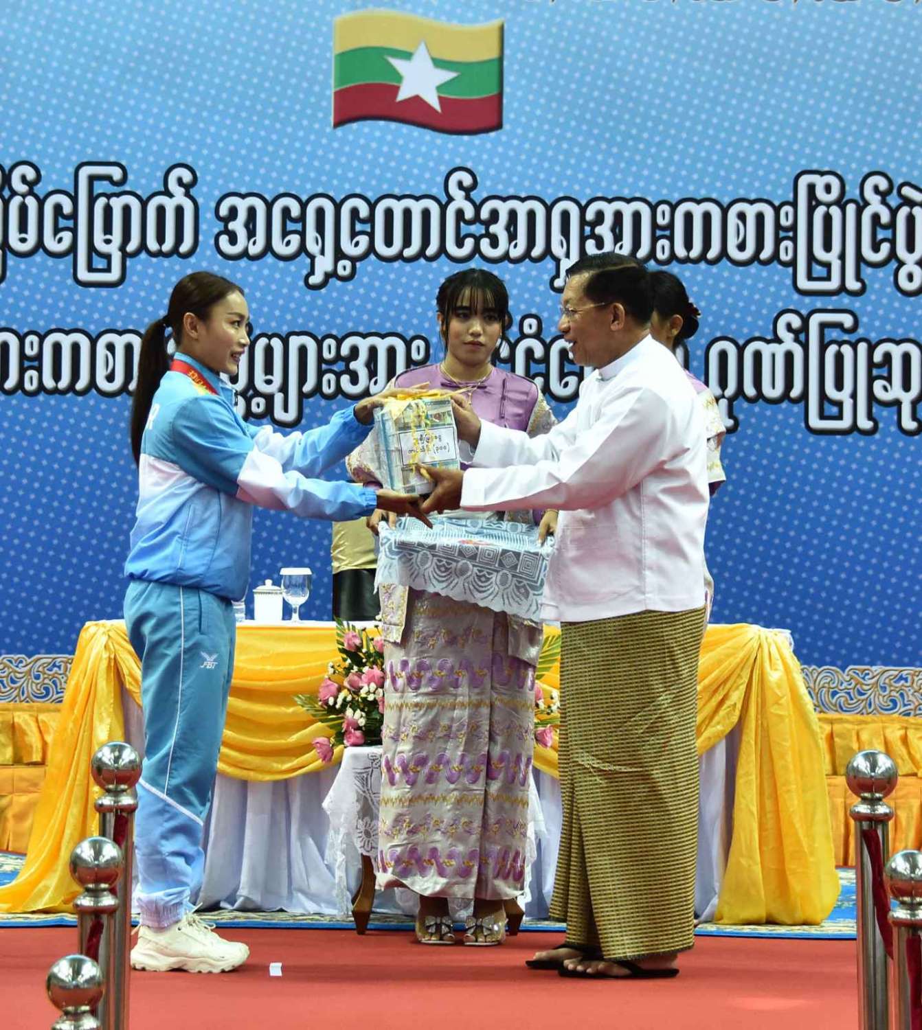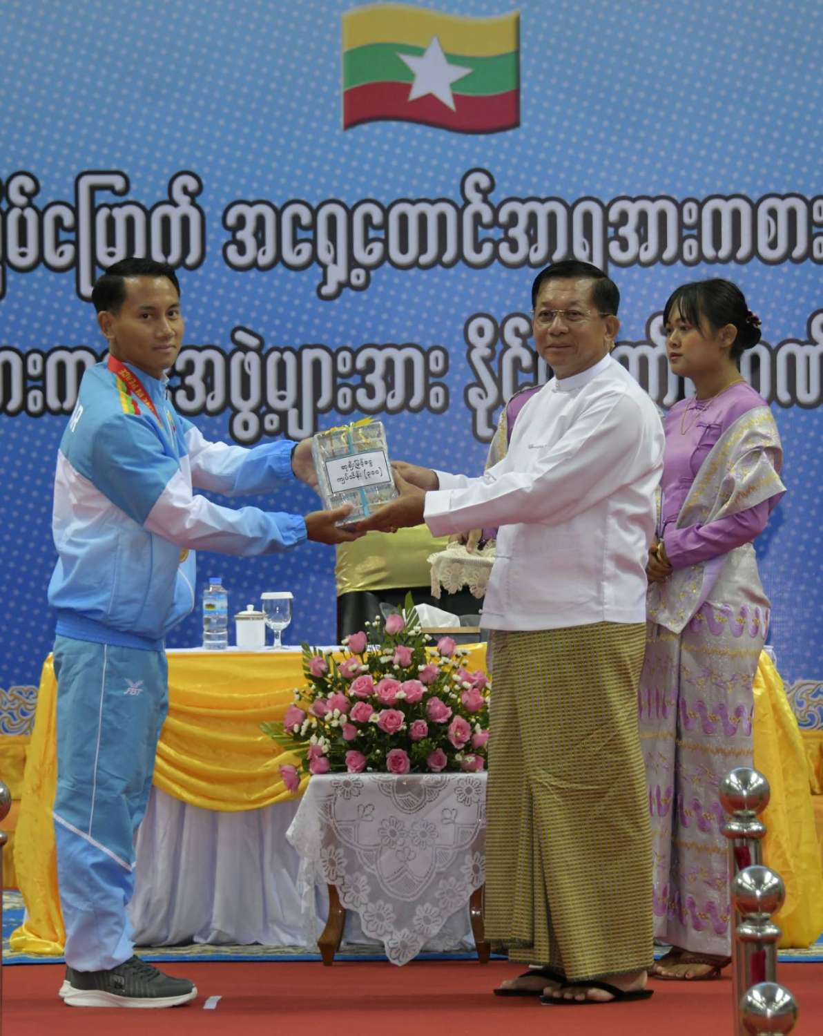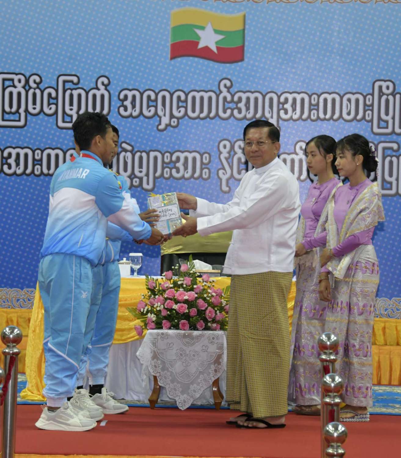 (၃၂) ကြိမ်မြောက် အရှေ့တောင်အာရှအားကစားပြိုင်ပွဲတွင် ဆုတံဆိပ်ရရှိခဲ့သည့် မြန်မာအားကစားအဖွဲ့များအား နိုင်ငံတော်က ဂုဏ်ပြုဆုချီးမြှင့်ခြင်းအခမ်းအနားကျင်းပ၊ နိုင်ငံတော်စီမံအုပ်ချုပ်ရေးကောင်စီဥက္ကဋ္ဌ နိုင်ငံတော်ဝန်ကြီးချုပ် ဗိုလ်ချုပ်မှူးကြီး မင်းအောင်လှိုင် တက်ရောက်အမှာစကားပြောကြားပြီး ဂုဏ်ပြုဆုများ ပေးအပ်ချီးမြှင့်