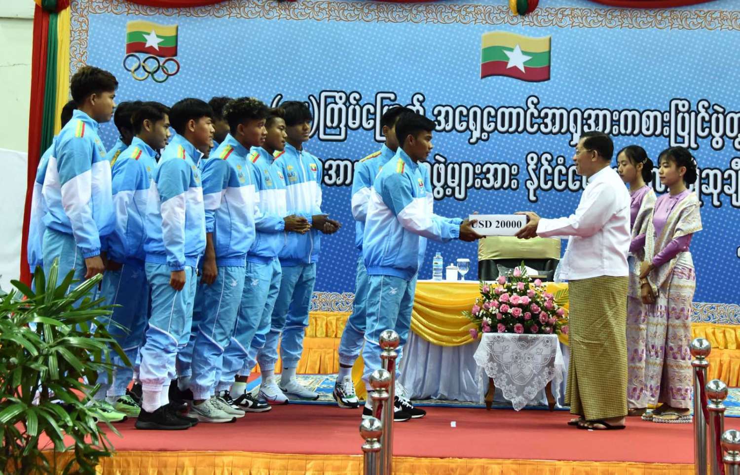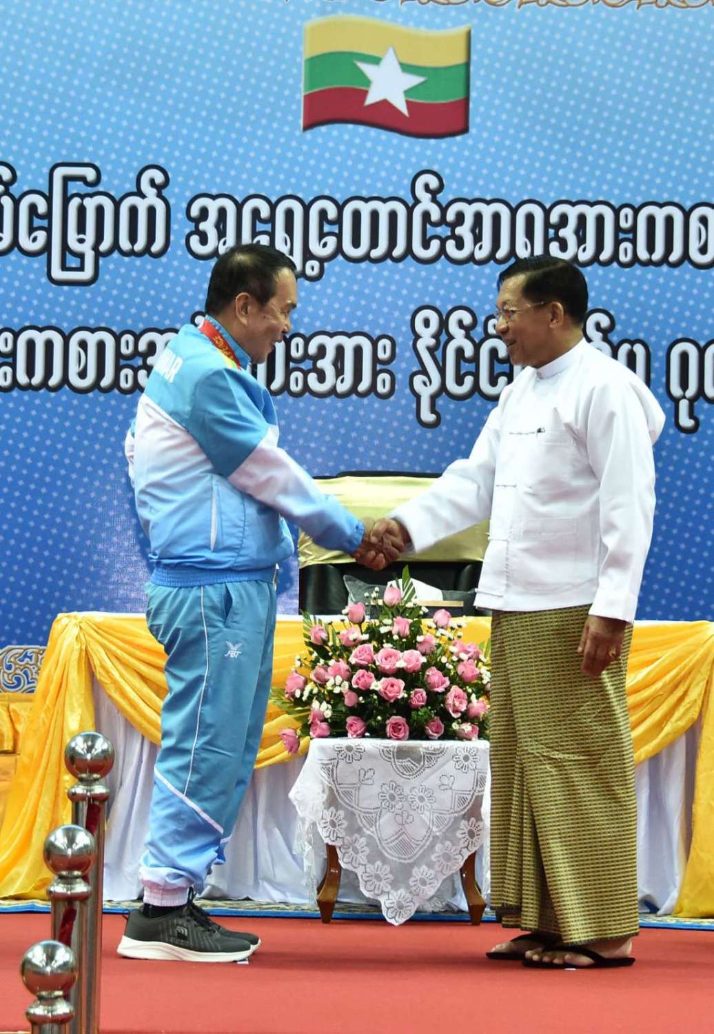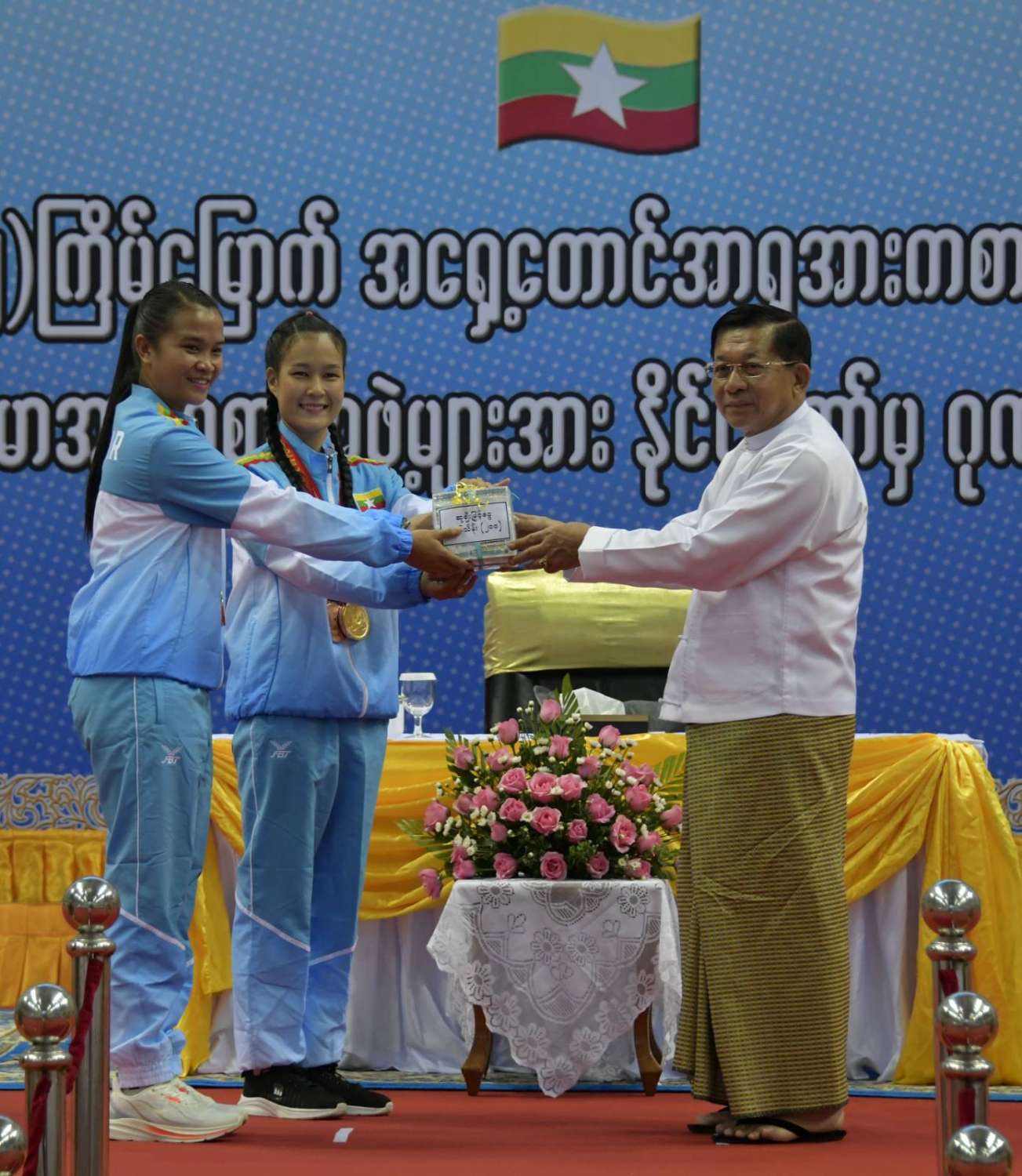 (၃၂) ကြိမ်မြောက် အရှေ့တောင်အာရှအားကစားပြိုင်ပွဲတွင် ဆုတံဆိပ်ရရှိခဲ့သည့် မြန်မာအားကစားအဖွဲ့များအား နိုင်ငံတော်က ဂုဏ်ပြုဆုချီးမြှင့်ခြင်းအခမ်းအနားကျင်းပ၊ နိုင်ငံတော်စီမံအုပ်ချုပ်ရေးကောင်စီဥက္ကဋ္ဌ နိုင်ငံတော်ဝန်ကြီးချုပ် ဗိုလ်ချုပ်မှူးကြီး မင်းအောင်လှိုင် တက်ရောက်အမှာစကားပြောကြားပြီး ဂုဏ်ပြုဆုများ ပေးအပ်ချီးမြှင့်