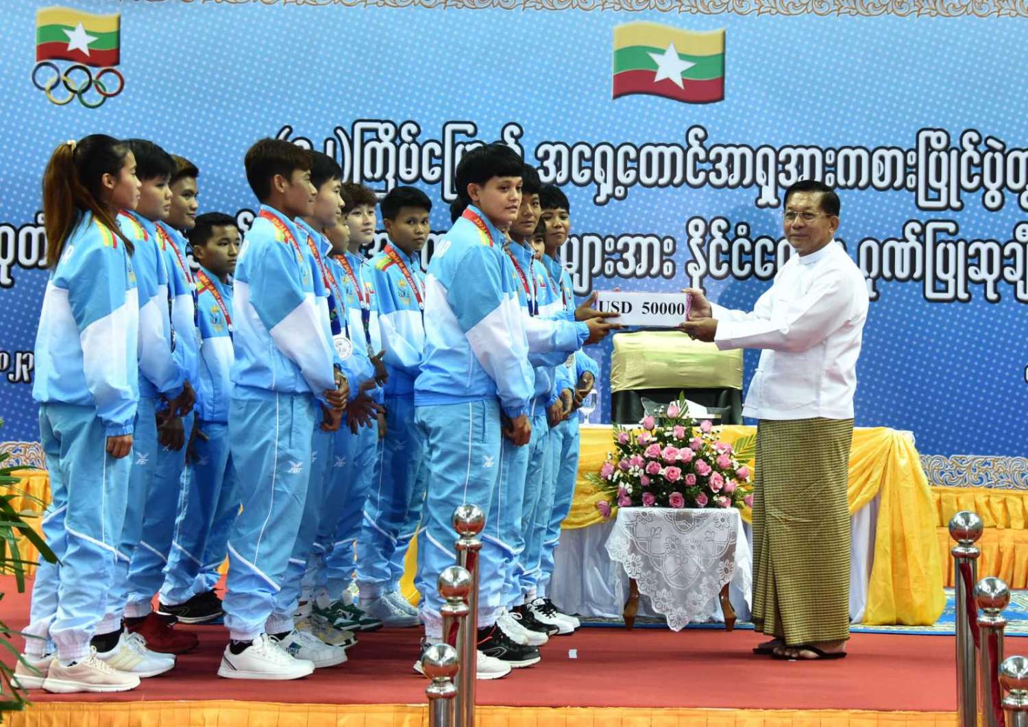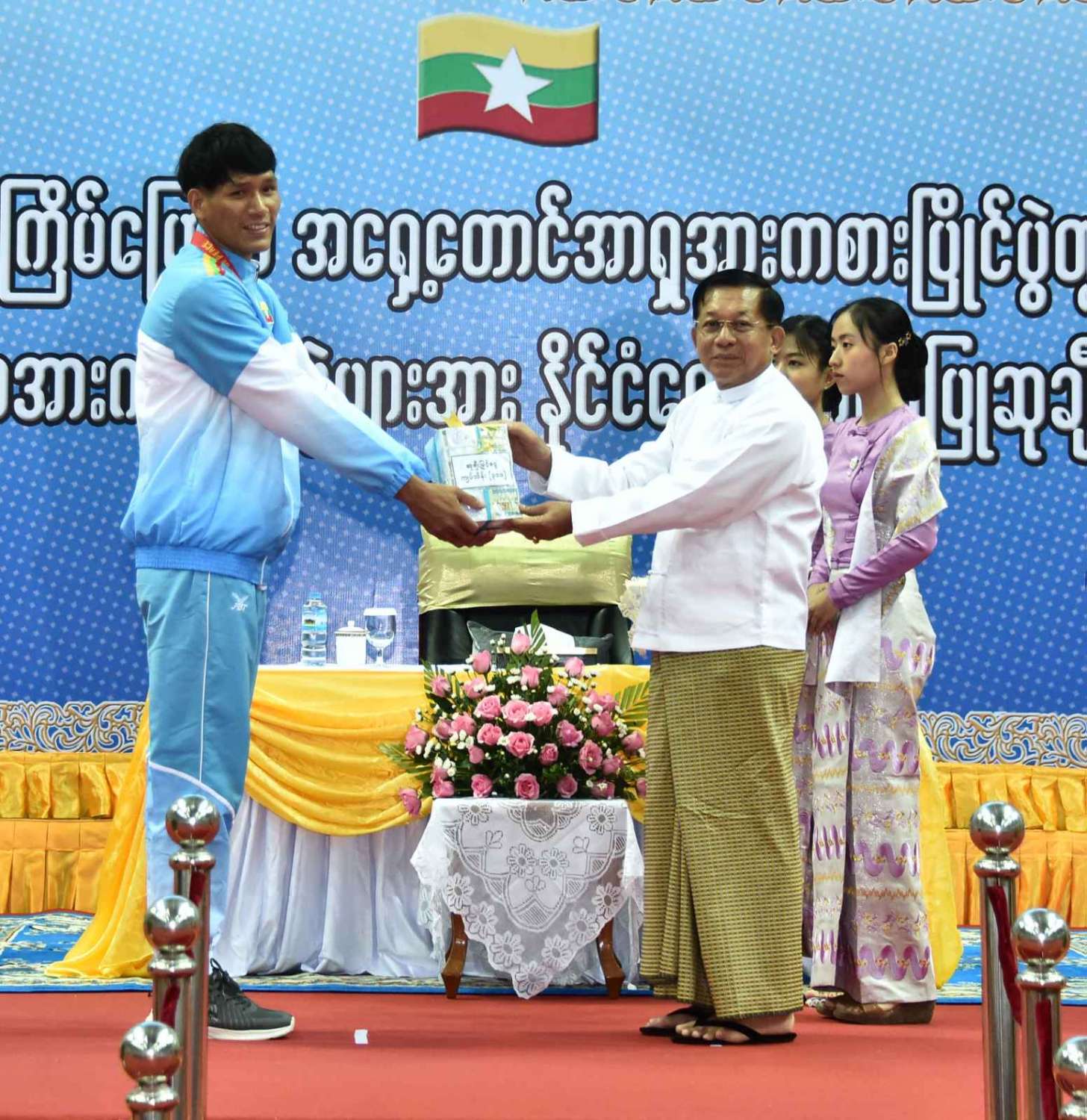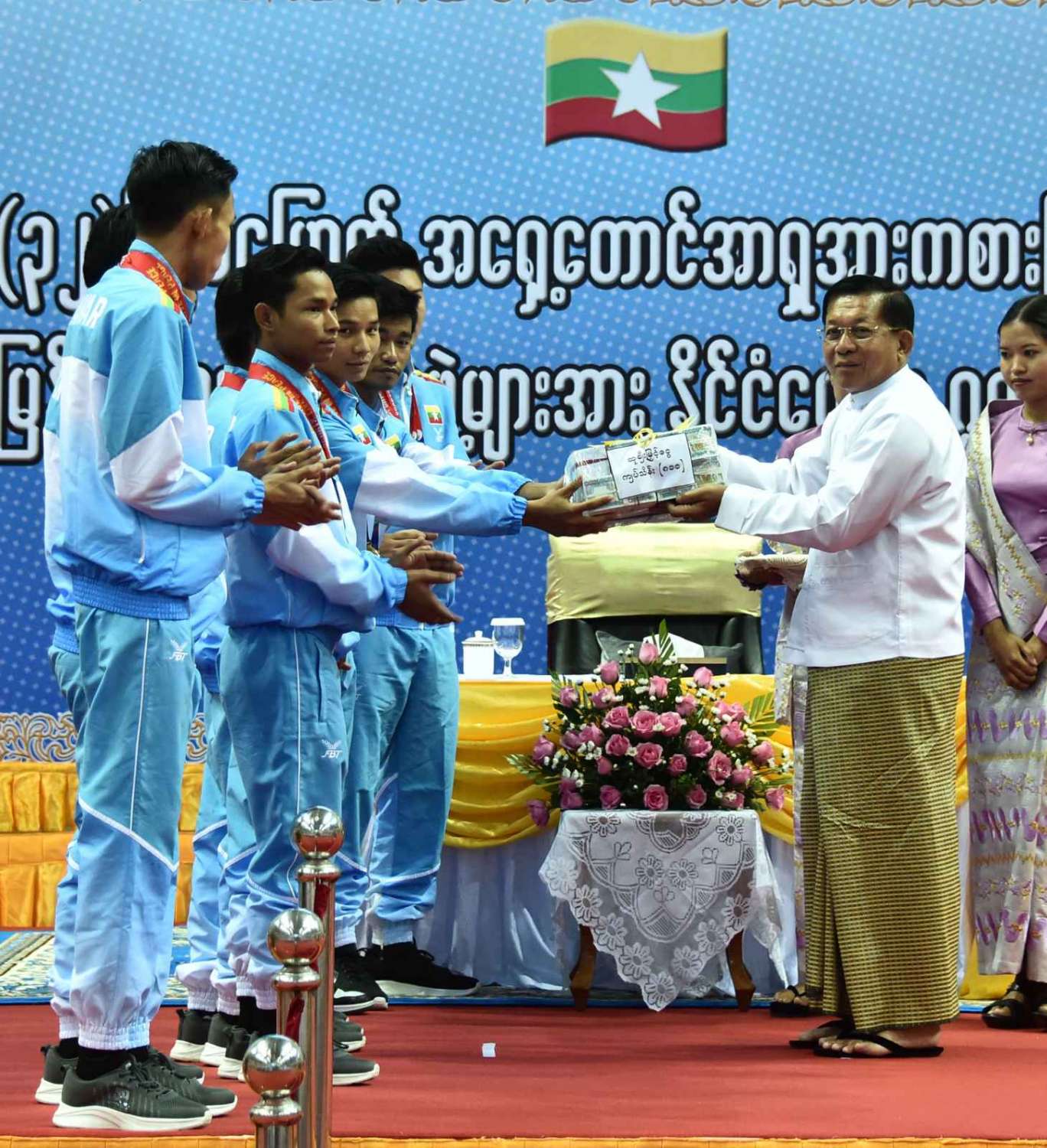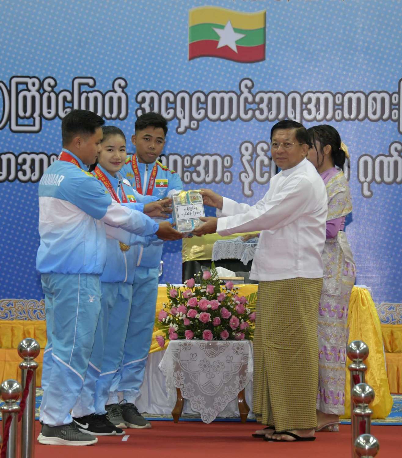 ထို့နောက် (၃၂)ကြိမ်မြောက် အရှေ့တောင်အာရှ အားကစားပြိုင်ပွဲတွင် ဆုတံဆိပ်ရရှိခဲ့သည့် နိုင်ငံ့ဂုဏ်ဆောင် ဆုရအားကစားသမားများ၊ နည်းပြများနှင့် အုပ်ချုပ်သူများကို ဂုဏ်ပြုဆုငွေများ ပေးအပ်ချီးမြှင့်ရာ နိုင်ငံတော်စီမံအုပ်ချုပ်ရေးကောင်စီဥက္ကဋ္ဌ နိုင်ငံတော်ဝန်ကြီးချုပ်က ရွှေတံဆိပ်ဆုရရှိခဲ့ကြသည့် ဗိုဗီနမ်အားကစားနည်းမှ မောင်အိုက်စိုးလင်း၊ မခိုင်ဝါဖူးနှင့် မမေဟန်နီအောင်လွင်၊ မောင်မနားကွီးနှင့် မောင်တင်ထူးဇော်၊ မောင်အောင်ခိုင်လင်း၊ မောင်ဟိန်းထက်အောင်၊ မောင်ကျော်သူစိုးအောင်၊ မောင်ရာဇာထွန်း၊ ဗိုဗီနမ် (ခွန်ဘိုကာတာ) ကစားနည်းမှ မောင်ပိုင်ဇေယျာဖြိုး၊ မောင်အံ့ဘွယ်ငြိမ်း၊ မနီလာစိုးဦး၊ ဗိုဗီနမ်(အားနစ်) ကစားနည်းမှ မောင်စည်သူမောင်၊ မောင်ဇော်သက်၊ မောင်ရဲဇော်မိုး၊ မောင်မျိုးထွန်းအံ့၊ ခြင်းလုံးအားကစားနည်းမှ Same Stroke Event-2 အမျိုးသမီးအသင်း၊ Linking (Preliminary) Event-3 အမျိုးသား၊ အမျိုးသမီးအသင်း၊ Non Repetition Secondary Event-4 အမျိုးသားအသင်း၊ Non Repetition Secondary Event-4 အမျိုးသမီးအသင်း၊ ပိုက်ကျော်ခြင်း အားကစားနည်း၊ ကွင်းသွင်းကစားနည်းမှ အမျိုးသားအသင်း၊ ကွင်းသွင်းခြင်းကစားနည်းမှ အမျိုးသမီးအသင်း၊ ဘိလိယက်/စနူကာ အားကစားနည်းမှ ဦးပေါက်စ၊ မောင်မောင် (ခ) ဘုန်းမြင့်ကျော် (ကိုယ်စား) အားကစားသမားတစ်ဦး၊ မောင်သော်ဇင်ထက်၊ ဝူရှူးအားကစားနည်းမှ မစန္ဒီဦး၊ ရိုးရာလှေ အသက် (၂၄) နှစ်အောက် အမျိုးသား ငါးယောက်လှော် မီတာ ၂၅၀ အားကစား အသင်း၊ တိုက်ကွမ်ဒို အားကစားနည်းမှ မောင်ကျော်မင်းနိုင်၊ အလေးမအားကစားနည်းမှ မဇင်မေဦး၊ ပီတန်းအားကစားနည်းမှ မခင်ချယ်ရီသက်တို့အား ဂုဏ်ပြုချီးမြှင့်ငွေများ ပေးအပ်ချီးမြှင့်သည်။