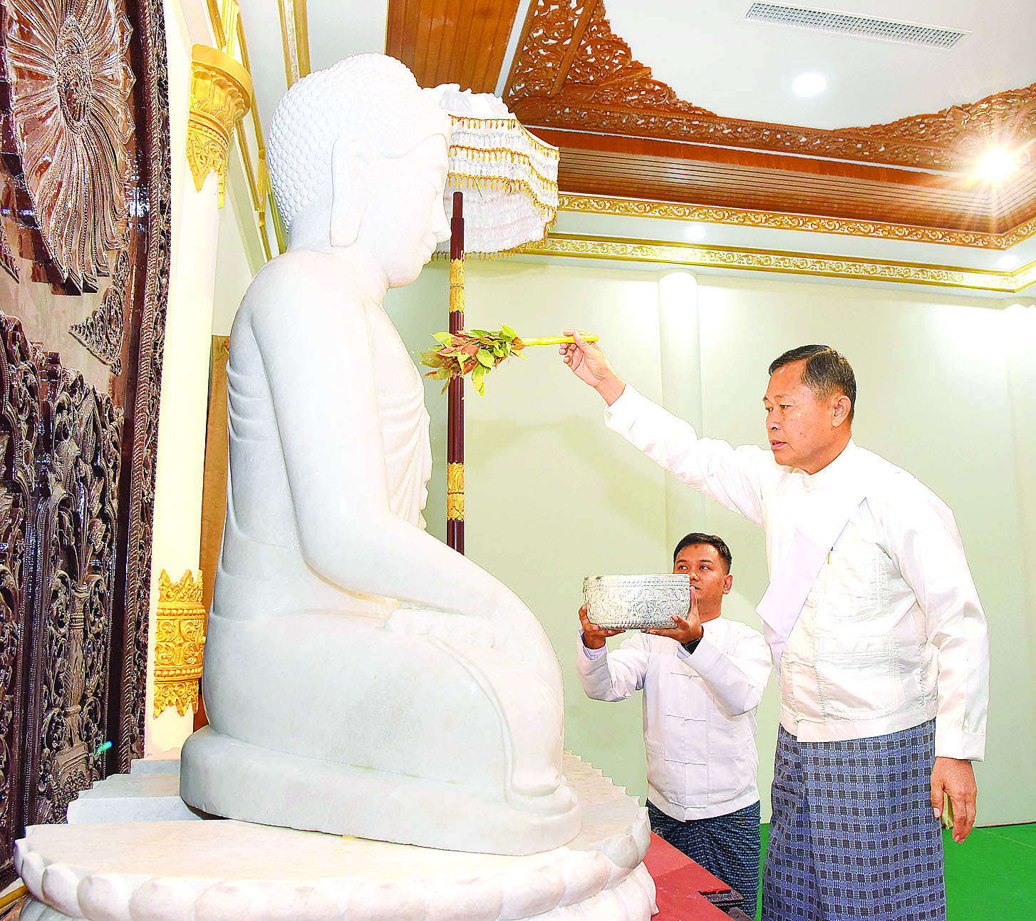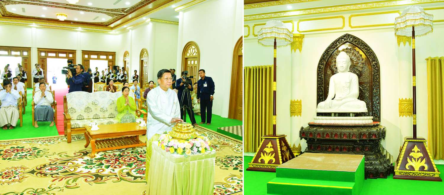 မာရဝိဇယဗုဒ္ဓ ရုပ်ပွားတော်မြတ်ကြီးတည်ဆောက်လျက်ရှိသည့် ပြည်ထောင်စုနယ်မြေ နေပြည်တော်၊ ဒက္ခိဏသီရိမြို့နယ်ရှိ မာရဝိဇယဗုဒ္ဓဥယျာဉ်တော်အတွင်းရှိ မာရဝိဇယကျောင်းတော်သို့ ဗုဒ္ဓရုပ်ပွားတော် ပင့်ဆောင်ပူဇော်ခြင်းနှင့် သာသနာ့ဗိမာန်အဂ္ဂါဓိပတိဝိသုံဂါမသိမ်တော်ကြီးသို့ နောင်တော်ကြီးဗုဒ္ဓရုပ်ပွားတော် ပင့်ဆောင်ပူဇော်ခြင်းမင်္ဂလာအခမ်းအနားတို့ကို ယနေ့နံနက်ပိုင်းတွင်ကျင်းပပြုလုပ်ရာ ဦးဆောင်ဘုရားဒါယကာ နိုင်ငံတော်စီမံအုပ်ချုပ်ရေးကောင်စီဥက္ကဋ္ဌ နိုင်ငံတော်ဝန်ကြီးချုပ်ဗိုလ်ချုပ်မှူးကြီးမင်းအောင်လှိုင် တက်ရောက်ပူဇော်သည်။