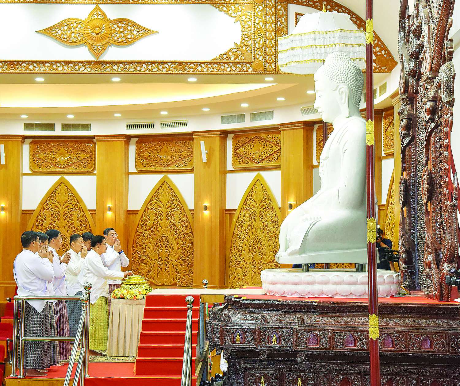 ယင်းနောက် ဦးဆောင်ဘုရားဒါယကာ နိုင်ငံတော်စီမံအုပ်ချုပ်ရေးကောင်စီဥက္ကဋ္ဌ နိုင်ငံတော်ဝန်ကြီးချုပ်အမှူးပြုသည့် ဧည့်ပရိသတ်များက ရတနတ္တယပူဇာဂါထာတော်နှင့် သဗ္ဗသင်္ဂါဟက မေတ္တာပို့လင်္ကာနှစ်ပိုဒ်ကို သံပြိုင်ညီညာသုံးကြိမ် ရွတ်ဆိုပူဇော်ကြသည်။