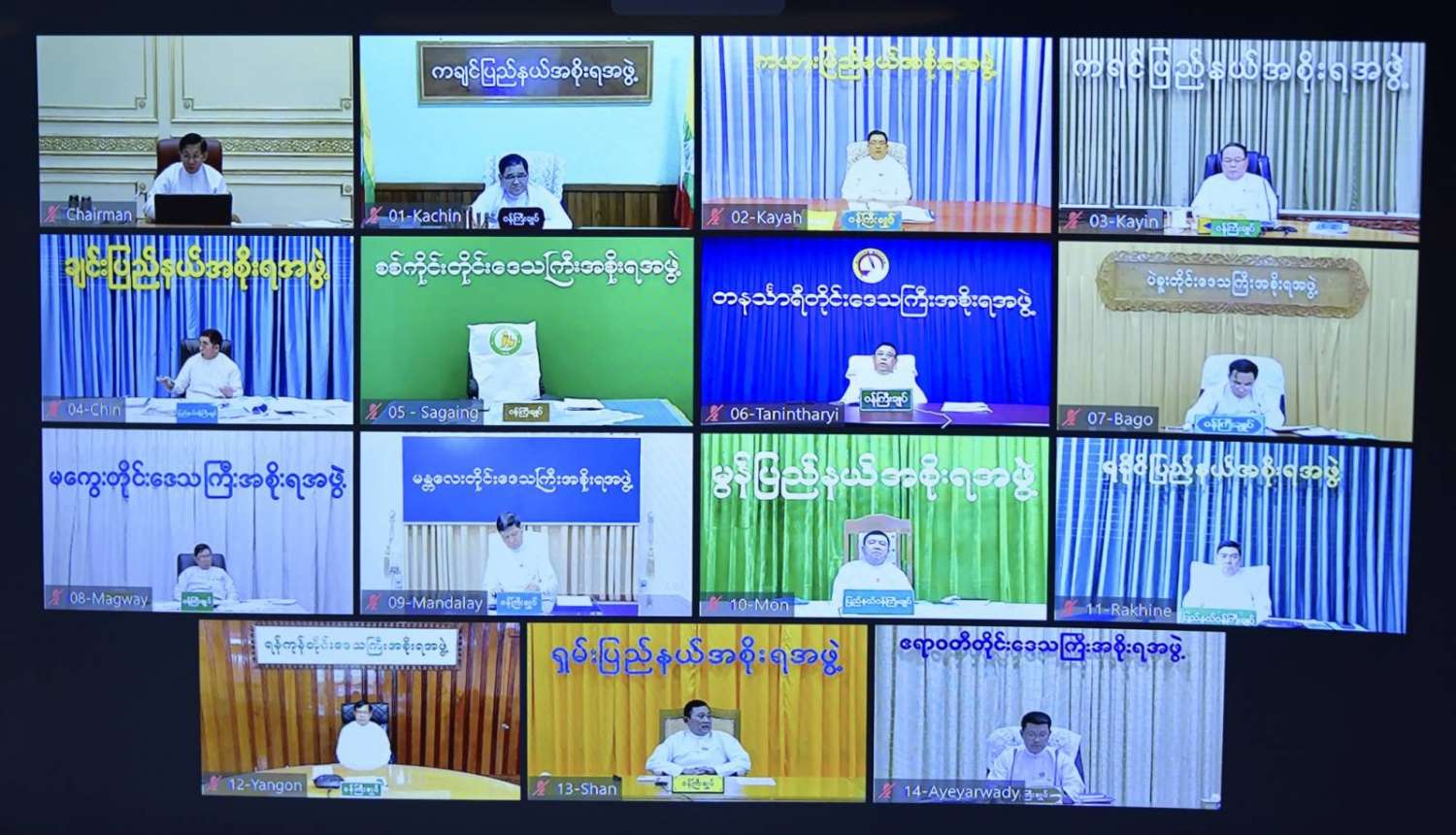 ထို့နောက် နေပြည်တော်ကောင်စီဥက္ကဋ္ဌနှင့် တိုင်းဒေသကြီးနှင့် ပြည်နယ်ဝန်ကြီးချုပ်များက နေပြည်တော်ကောင်စီနယ်မြေ၊ တိုင်းဒေသကြီးနှင့် ပြည်နယ်များအတွင်းရှိ မြို့နယ်များ၊ ကျေးရွာများ ဖွံ့ဖြိုးတိုးတက်ရေး ဆောင်ရွက်နေမှု၊ နိုင်ငံ့စီးပွားမြှင့်တင်ရေးရန်ပုံငွေဖြင့် စိုက်ပျိုးရေး၊ မွေးမြူရေးနှင့် MSME လုပ်ငန်းများ ဖွံ့ဖြိုးတိုးတက်ရေးဆောင်ရွက်နေမှု၊ သီးနှံအလိုက် အထွက်နှုန်းတိုးတက်ရေးနှင့် ဒေသအတွင်း စားရေရိက္ခာဖူလုံရေးဆောင်ရွက်ထားရှိမှု၊ စိုက်ပျိုးမွေးမြူရေးလုပ်ငန်းများ တိုးချဲ့ဆောင်ရွက်သွားရေးနှင့် ပြည်တွင်းထုတ်ကုန်များ တိုးမြှင့်ထုတ်လုပ်နိုင်ရေးဆောင်ရွက်နေမှု၊ ပြည်ပသို့ ပို့ကုန်များတိုးမြှင့်တင်ပို့နိုင်ရေးနှင့် ဈေးကွက်ရရှိရေးဆောင်ရွက်နေမှု၊ ရေထွက်ပစ္စည်း ထုတ်လုပ်နိုင်မှုနှင့် နိုင်ငံခြားဝင်ငွေရရှိမှု၊ KG + 9 ပြီးမြောက်သူများ တက်ရောက်နိုင်သည့် စက်မှု၊ စိုက်ပျိုး၊ မွေးမြူရေးသင်တန်းကျောင်းများ ဖွင့်လှစ်သင်ကြားပေးနေမှုအခြေအနေများကို ရှင်းလင်းတင်ပြကြသည်။
