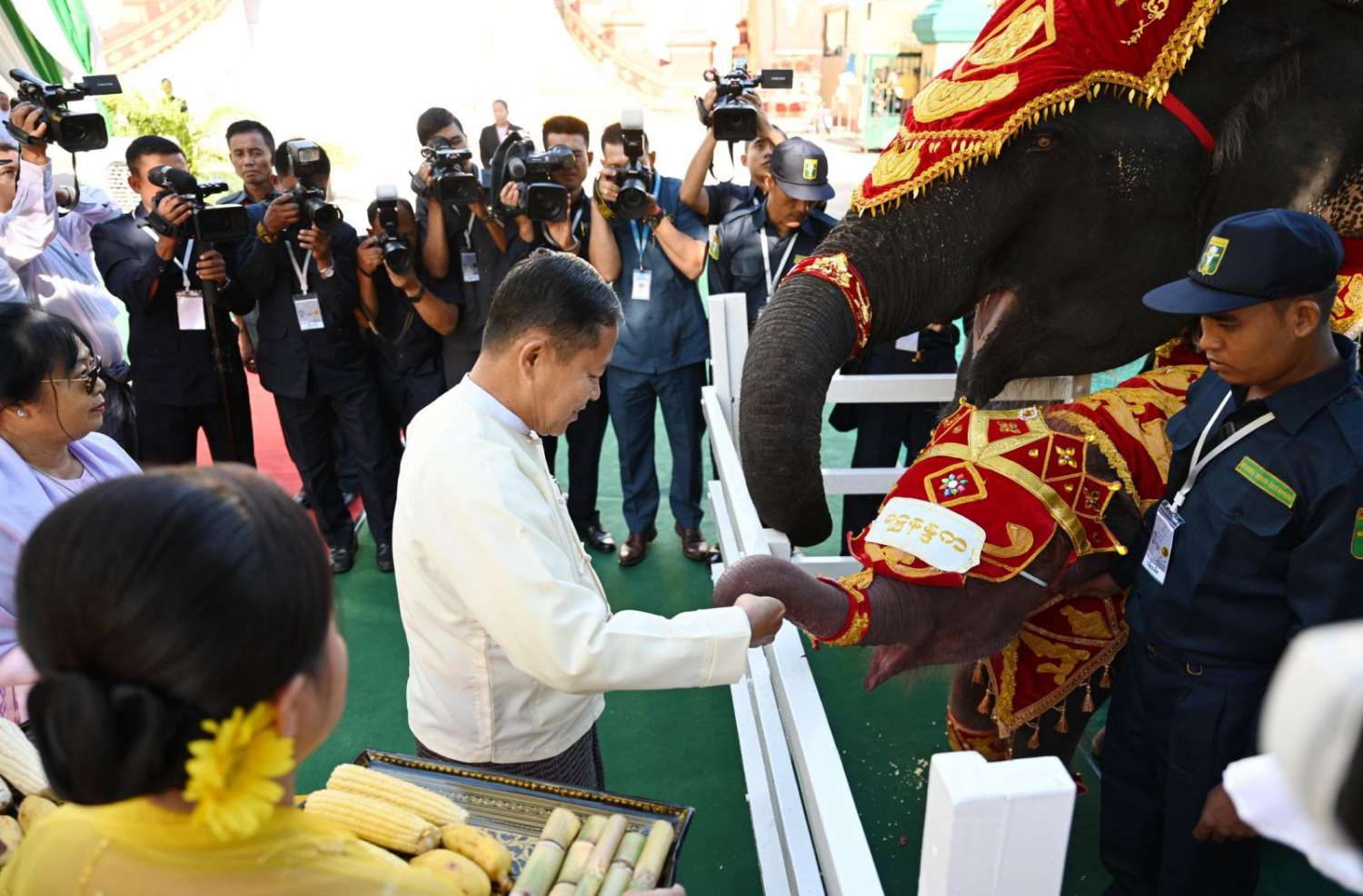 အခမ်းအနားအပြီးတွင် နိုင်ငံတော်စီမံအုပ်ချုပ်ရေးကောင်စီဥက္ကဋ္ဌ နိုင်ငံတော်ဝန်ကြီးချုပ်နှင့်ဇနီးတို့က အခမ်းအနားအောင်မြင်ခြင်းအထိမ်းအမှတ် ရတနာရွှေမိုး ငွေမိုးများ ရွာသွန်းဖြိုးကြပြီး အခမ်းအနားတက်ရောက်လာကြသူများနှင့်အတူ ရတနာဆင်ဖြူတော်ဆောင်အတွင်းရှိ ရတနာဆင်ဖြူတော်များနှင့် ရတနာဆင်ဖြူတော် အဖော်ဆင်များကို အစာအာဟာရများ ကျွေးမွေးခဲ့ကြသည်။