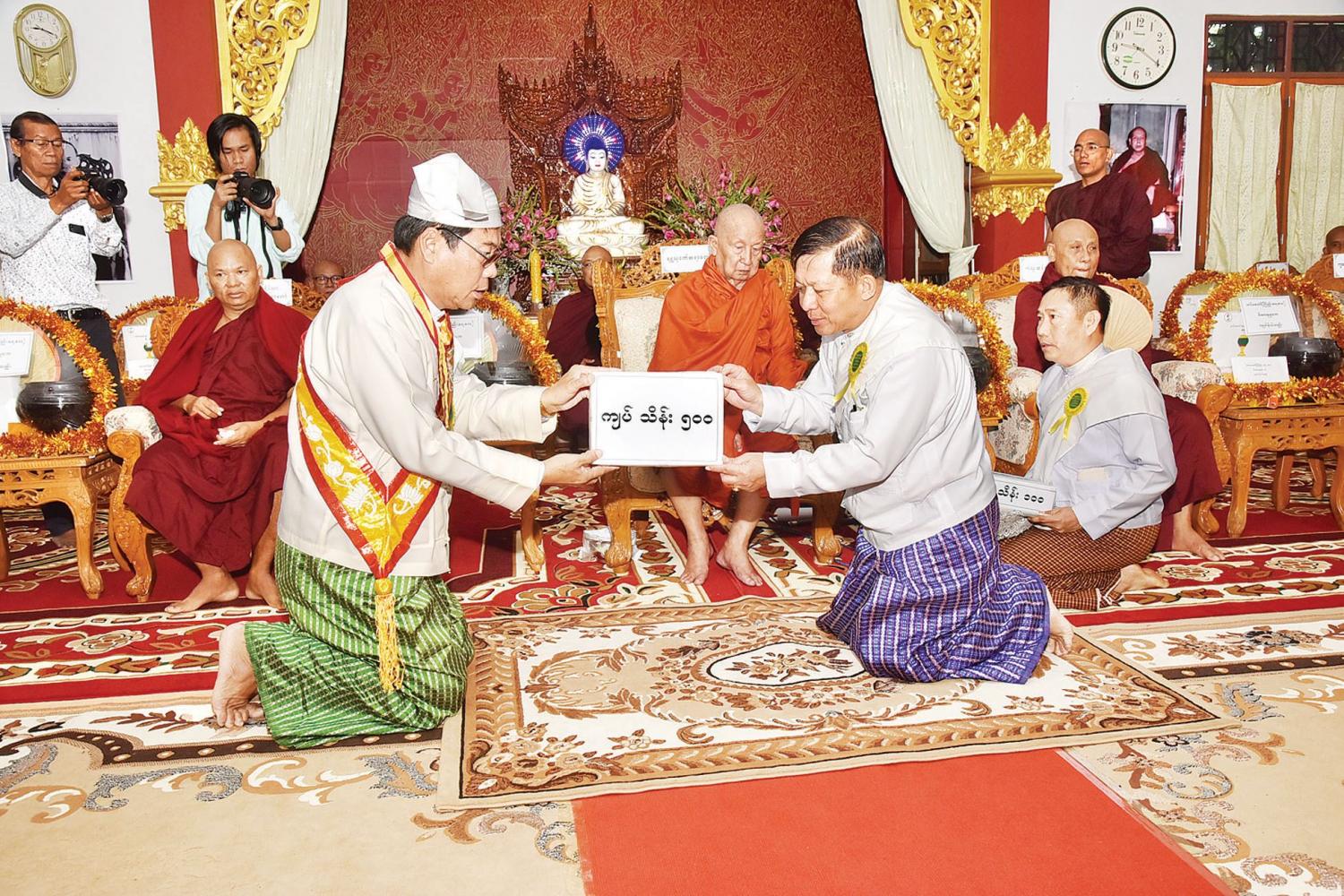 ထို့နောက် တပ်မတော်ကာကွယ်ရေးဦးစီးချုပ်က ရွှေသုဝဏ်ဆရာတော်ကြီးထံ လှူဖွယ်ပစ္စည်းများ ဆက်ကပ်လှူဒါန်းပြီး ငါးထပ်ကျောင်းတော်ကြီးအတွက် တပ်မတော် (ကြည်း၊ ရေ၊ လေ) မိသားစုများက လှူဒါန်းသည့် အလှူတော်ငွေ ကျပ်သိန်း ၅၀၀ နှင့် တပ်မတော် ကာကွယ်ရေး ဦးစီးချုပ် မိသားစုက လှူဒါန်းသည့် အလှူငွေများကို ပေးအပ်လှူဒါန်းရာ ဓမ္မစကြာပဋိပတ်ရိပ်သာ ဥပတ္ထမ္ဘ မဟာသီရိသုဓမ္မ မဏိဇောတဓရ ဦးစိန်လှဝင်း က လက်ခံရယူကာ ဂုဏ်ပြုမှတ်တမ်းလွှာ ပြန်လည်ပေးအပ်သည်။ ယင်းနောက် တပ်မတော်ကာကွယ်ရေးဦးစီးချုပ်အား ရွှေသုဝဏ်ဆရာ တော်ကြီးကကျမ်းစာအုပ်များ ဓမ္မ လက်ဆောင်အဖြစ် ပြန်လည်ပေးအပ်သည်။
