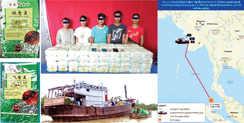 မလေးရှားနိုင်ငံနှင့် အင်ဒိုနီးရှားနိုင်ငံအကြားရှိ မလေးရှားပိုင်ရေပြင်သို့ပို့ဆောင်မည့် ငွေကျပ် ၃၁ ဒသမ ၇၄ ဘီလီယံကျော်တန်ဖိုးရှိ အိုက်စ်(မက်အဖက်တမင်း)များအား ရခိုင်ပြည်နယ် ကျိန္တလီမြို့အနီးရေပြင်၌ ဖမ်းဆီးရမိ