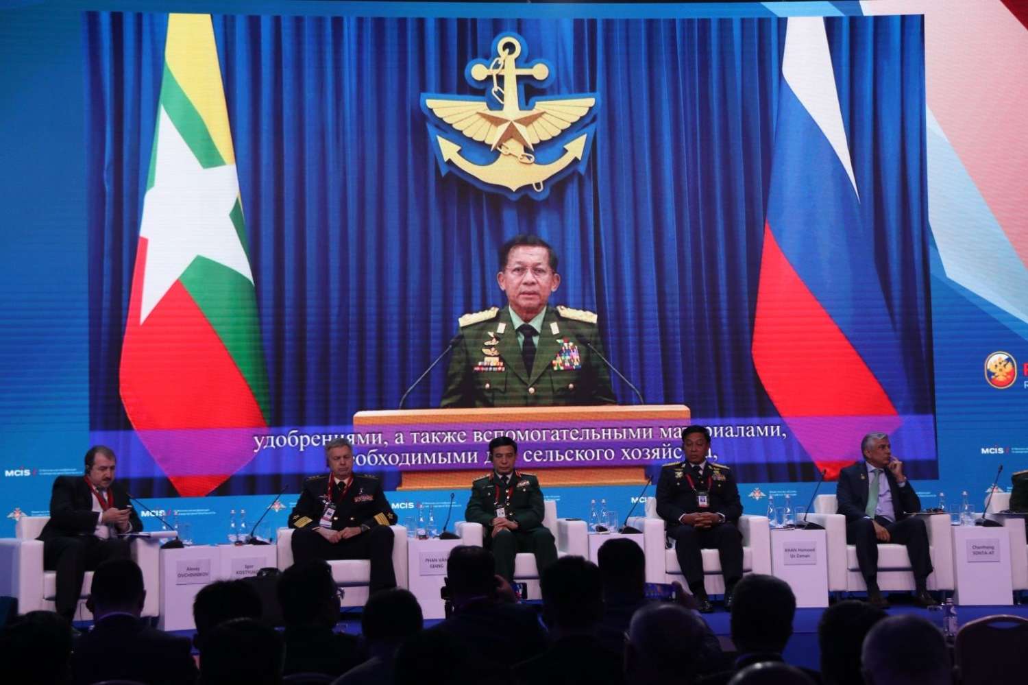 (၁၁)ကြိမ်မြောက် နိုင်ငံတကာလုံခြုံရေးညီလာခံ (MCIS – 2023)ကို ရုရှားနိုင်ငံ၊ မော်စကိုမြို့ရှိ ရုရှားတပ်မတော်မျိုးချစ်ပန်းခြံတွင် ဩဂုတ် ၁၅ ရက်က ကျင်းပပြုလုပ်ရာ နိုင်ငံတော်စီမံအုပ်ချုပ်ရေးကောင်စီဥက္ကဋ္ဌ တပ်မတော်ကာကွယ်ရေးဦးစီးချုပ် ဗိုလ်ချုပ်မှူးကြီး မင်းအောင်လှိုင် မိန့်ခွန်း Video Message ပေးပို့တက်ရောက်သည်။