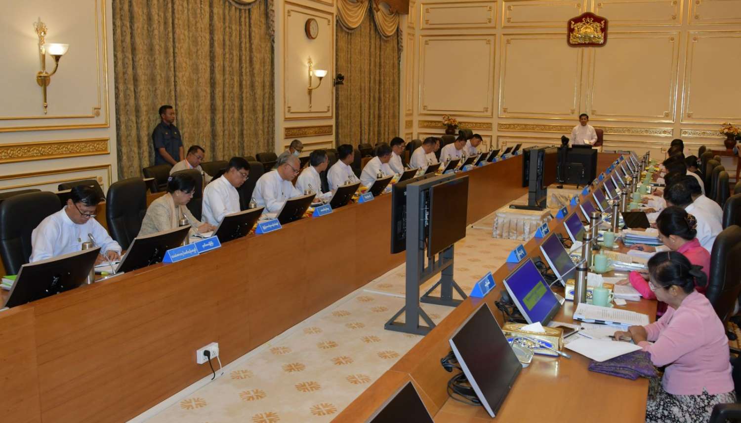 ယင်းနောက် နိုင်ငံခြားဝန်ကြီးဌာန၊ ပြည်ထဲရေးဝန်ကြီးဌာန၊ နယ်စပ်ရေးရာဝန်ကြီးဌာန၊ ရင်းနှီးမြှုပ်နှံမှုနှင့် နိုင်ငံခြားစီးပွားဆက်သွယ်ရေးဝန်ကြီးဌာန၊ ပြန်ကြားရေးဝန်ကြီးဌာန၊ သာသနာရေးနှင့်ယဉ်ကျေးမှုဝန်ကြီးဌာန၊ စိုက်ပျိုးရေး၊ မွေးမြူရေးနှင့်ဆည်မြောင်းဝန်ကြီးဌာန၊ သယံဇာတနှင့် သဘာဝပတ်ဝန်းကျင်ထိန်းသိမ်းရေးဝန်ကြီးဌာန၊ လျှပ်စစ်စွမ်းအားဝန်ကြီးဌာန၊ စွမ်းအင်ဝန်ကြီးဌာန၊ စက်မှုဝန်ကြီးဌာန၊ အားကစားနှင့်လူငယ်ရေးရာဝန်ကြီးဌာန၊ ဆောက်လုပ်ရေးဝန်ကြီးဌာန၊ စီးပွားရေးနှင့် ကူးသန်းရောင်းဝယ်ရေးဝန်ကြီးဌာနတို့မှ ပြည်ထောင်စုဝန်ကြီးများနှင့် ဒုတိယဝန်ကြီးများက မြန်မာနိုင်ငံနှင့် ရုရှားဖက်ဒရေးရှင်းနိုင်ငံအကြား ကုန်သွယ်မှုမြှင့်တင်ရေးဆိုင်ရာကိစ္စရပ်များ၊ မြန်မာ့အသံနှင့်ရုပ်မြင်သံကြား အဆင့်မြှင့်တင်ရေးအတွက် ဆောင်ရွက်မည့်ကိစ္စရပ်များ၊ မြန်မာ့ရိုးရာ အဆို၊ အက၊ အရေး၊ အတီးပြိုင်ပွဲများ အောင်မြင်စွာကျင်းပနိုင်ရေးကိစ္စရပ်များ၊ စိုက်ပျိုးမွေးမြူရေးလုပ်ငန်းများ ဖွံ့ဖြိုးတိုးတက်ရေးဆိုင်ရာကိစ္စရပ်များ၊ ငါးလုပ်ငန်းဆိုင်ရာသုတေသနလုပ်ငန်းများ ဖွံ့ဖြိုးတိုးတက်ရေးကိစ္စရပ်များ၊ လျှပ်စစ်ဓာတ်အားလိုင်းများ သွယ်တန်းရေးဆိုင်ရာကိစ္စရပ်များ၊ စက်မှုလုပ်ငန်းများ ဖွံ့ဖြိုးတိုးတက်ရေးအတွက် ဆောင်ရွက်လျက်ရှိသည့်ကိစ္စရပ်များ၊ အားကစား ကဏ္ဍဖွံ့ဖြိုးတိုးတက်ရေးအတွက် ချီးမြှင့်ငွေများ ပေအပ်ချီးမြှင့်မှုအခြေအနေများ၊ လမ်းများအဆင့်မြှင့်တင်ခြင်းကိစ္စရပ်များနှင့်ပတ်သက်၍ ရှင်းလင်းတင်ပြကြသည်။