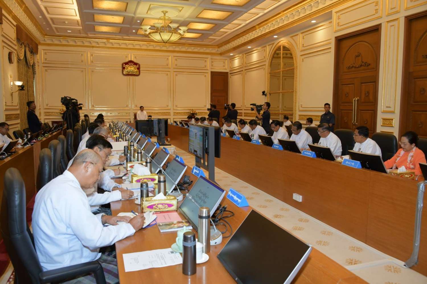 ယင်းနောက် အစည်းအဝေးသို့ တက်ရောက်လာကြသည့် ပြည်ထောင်စုဝန်ကြီးများက သက်ဆိုင်ရာကဏ္ဍအလိုက် ရှင်းလင်းတင်ပြကြသည်။