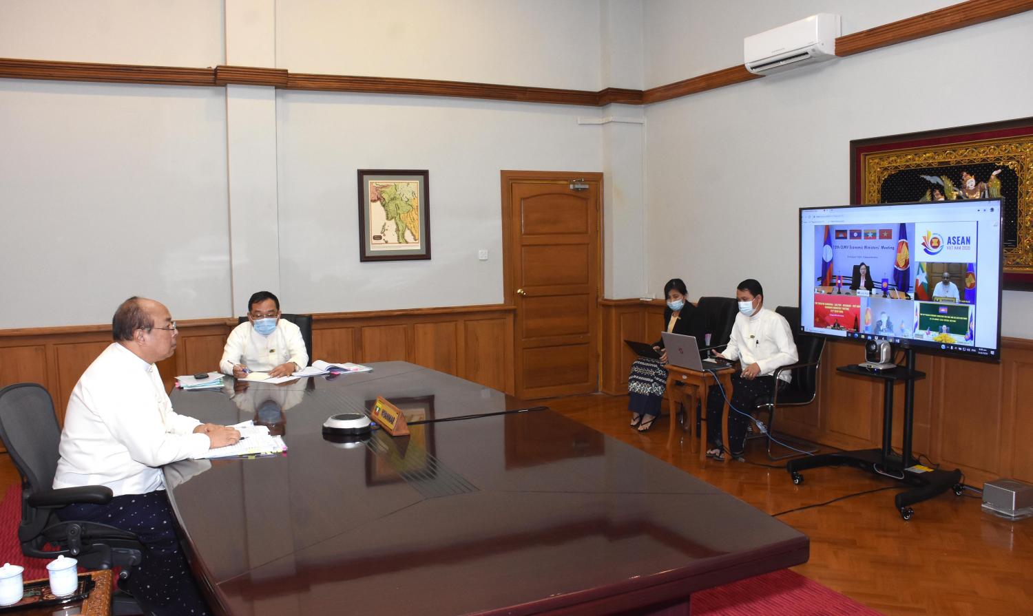 (၁၂) ကြိမ်မြောက် စီအယ်လ်အမ်ဗွီ စီးပွားရေးဝန်ကြီးများ အစည်းအဝေးကို ယနေ့နံနက် ၈ နာရီခွဲက ရင်းနှီးမြှုပ်နှံမှုနှင့် နိုင်ငံခြားစီးပွား ဆက်သွယ်ရေးဝန်ကြီးဌာန အစည်းအဝေးခန်းမတွင် Video Conferencing စနစ်ဖြင့် ကျင်းပသည်။