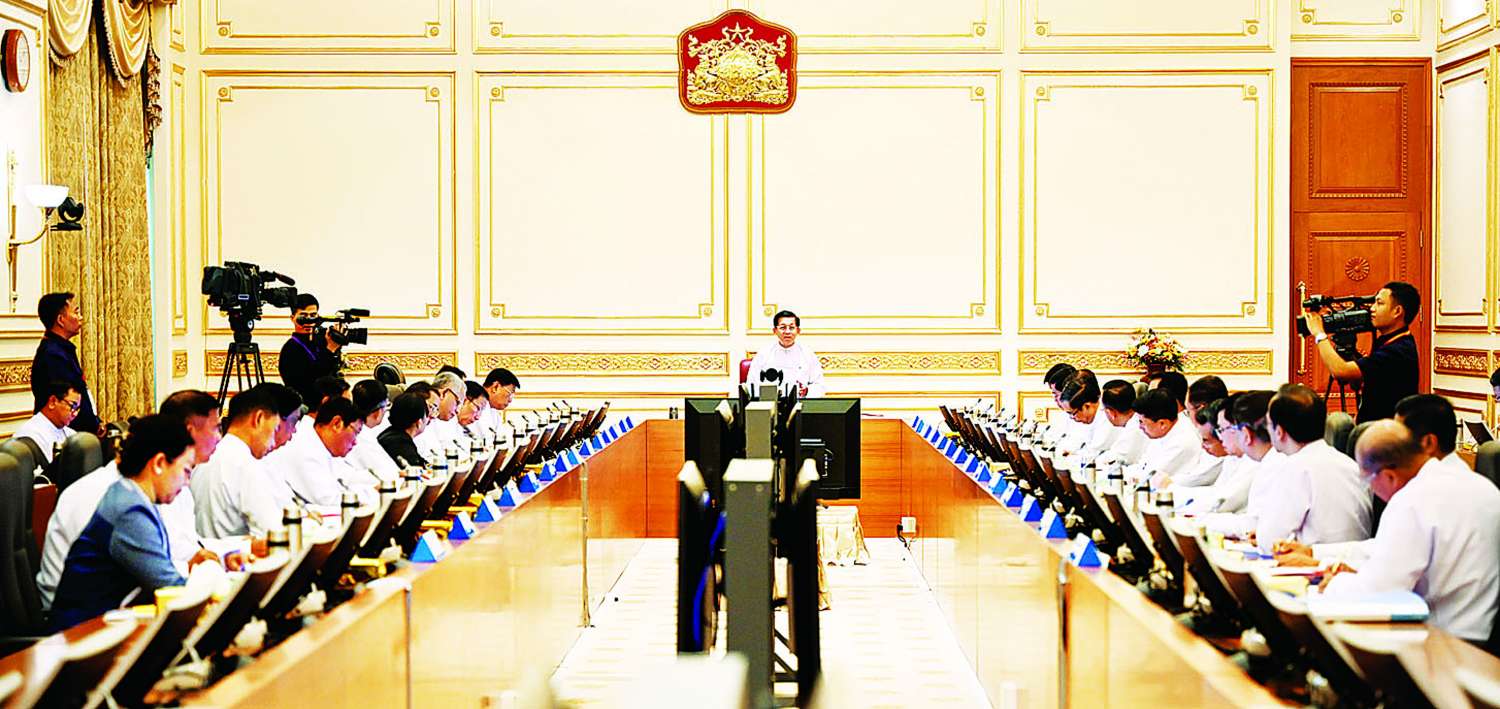 ပြည်ထောင်စုအစိုးရအဖွဲ့အစည်းအဝေး အမှတ်စဉ် (၆/၂၀၂၃) ကို ယနေ့နံနက်ပိုင်းတွင် နေပြည်တော်ရှိ နိုင်ငံတော်စီမံအုပ်ချုပ်ရေးကောင်စီဥက္ကဋ္ဌရုံး အစည်းအဝေးခန်းမ၌ကျင်းပရာ နိုင်ငံတော်စီမံအုပ်ချုပ်ရေးကောင်စီဥက္ကဋ္ဌ နိုင်ငံတော်ဝန်ကြီးချုပ် ဗိုလ်ချုပ်မှူးကြီး မင်းအောင်လှိုင် တက်ရောက်အမှာစကားပြောကြားသည်။