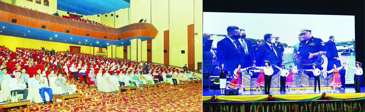 ရုရှားတပ်မတော်နှင့် မြန်မာ့တပ်မတော်အကြား ချစ်ကြည်ရင်းနှီးမှုများ ပိုမိုခိုင်မြဲစေရန် ရည်ရွယ်၍ မြန်မာ-ရုရှား နှစ်နိုင်ငံချစ်ကြည်ရေး မြန်မာ့တပ်မတော်ယဉ်ကျေးမှုအဖွဲ့နှင့် ရုရှားရေတပ်သံစုံတီးဝိုင်းအဖွဲ့ ဖျော်ဖြေပွဲအခမ်းအနားကို ယနေ့ညနေပိုင်းတွင် နေပြည်တော်ရှိ ဇေယျာသီရိဗိမာန်၊ သဘင်ဆောင်၌ ကျင်းပပြုလုပ်ရာ နိုင်ငံတော်စီမံအုပ်ချုပ်ရေးကောင်စီ ဥက္ကဋ္ဌ တပ်မတော်ကာကွယ်ရေးဦးစီးချုပ် ဗိုလ်ချုပ်မှူးကြီး မင်းအောင်လှိုင်နှင့် ဇနီး ဒေါ်ကြူကြူလှ တို့တက်ရောက်ကြည့်ရှုအားပေးသည်။