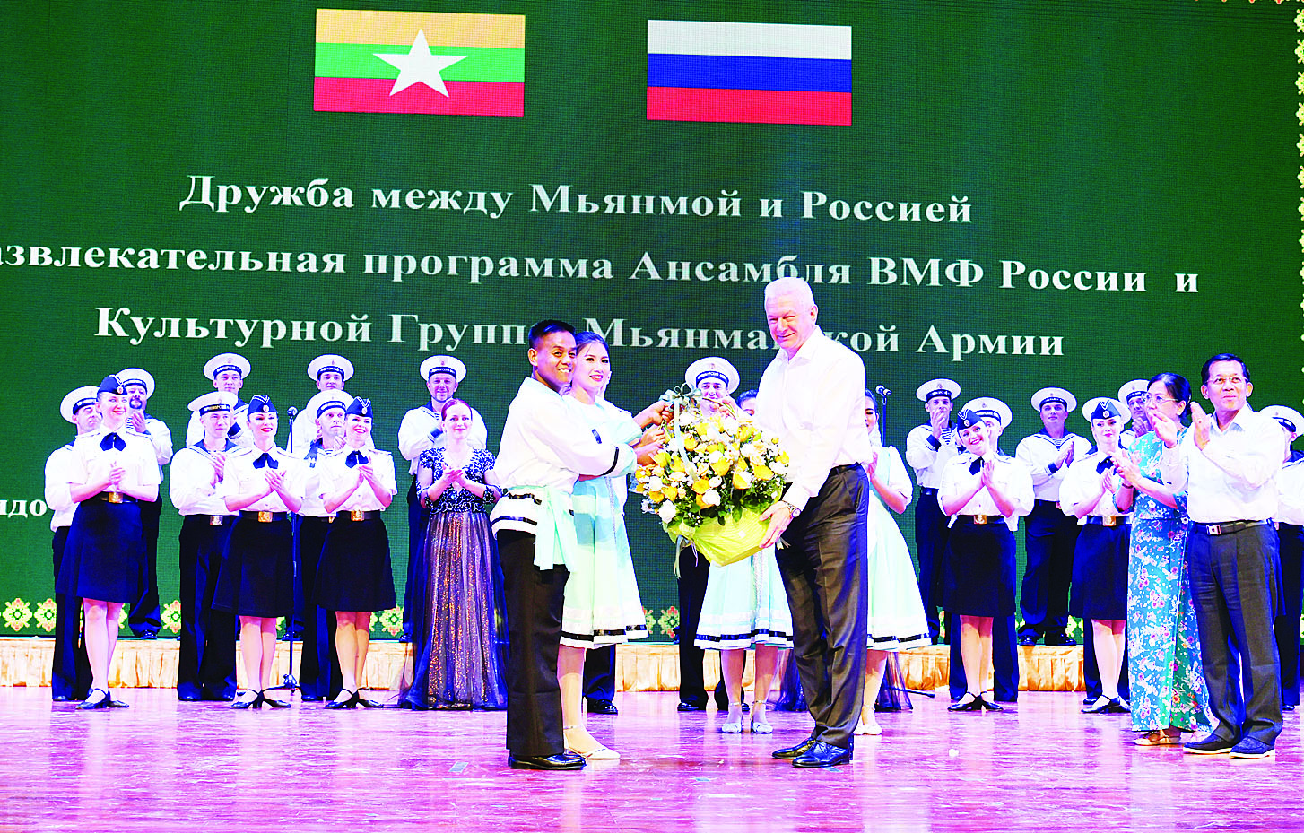 ဖျော်ဖြေပွဲအခမ်းအနားတွင် မြန်မာ-ရုရှားနှစ်နိုင်ငံချစ်ကြည်ရေး မြန်မာ့တပ်မတော် ယဉ်ကျေးမှုအဖွဲ့နှင့် ရုရှားရေတပ်သံစုံတီးဝိုင်းအဖွဲ့တို့မှ အနုပညာရှင်များကဖျော်ဖြေကြရာ ရုရှားရေတပ် သံစုံတီးဝိုင်းအဖွဲ့က ရုရှားသီချင်းများ၊ အကအလှများအပါအဝင် မြန်မာတေးသီချင်းကိုလည်းကောင်း၊ မြန်မာ့တပ်မတော်ယဉ်ကျေးမှုအဖွဲ့ မြဝတီ တေးဂီတအဖွဲ့က “ဆန်းသစ်လှပ ပုဂံယိမ်းအက” အပါအဝင် ရုရှားတေးသီချင်းဖြစ်သည့် “Katyusha” သီချင်းနှင့် “Kalinka” တေးသီချင်း တိုအား မြန်မာ့ရိုးရာတူရိယာ ပစ္စည်းများဖြစ်သည့် မြန်မာ့ဆိုင်းဝိုင်းကြီးနှင့် မြိုင်ဆိုင်စွာတီးခတ်ပြီး ရုရှားအကများဖြင့် လည်းကောင်း၊ ရုရှားတေးသီးချင်းဖြစ်သည့် “Ar Thi Na Si Me Yar” ကိုသီဆို၍လည်းကောင်း အသီးသီးဖျော်ဖြေတင်ဆက်ကြရာ နိုင်ငံတော်စီမံအုပ်ချုပ်ရေးကောင်စီ ဥက္ကဋ္ဌ တပ်မတော်ကာကွယ်ရေးဦးစီးချုပ်နှင့်ဇနီး၊ တက်ရောက်လာကြသူများက ကြည့်ရှု အားပေးကြသည်။