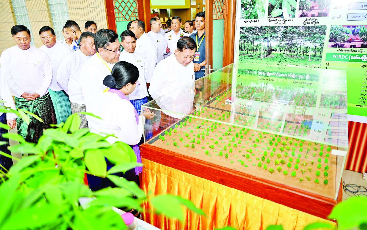ယင်းနောက် နိုင်ငံတော်စီမံအုပ်ချုပ်ရေးကောင်စီ ဥက္ကဋ္ဌ နိုင်ငံတော်ဝန်ကြီးချုပ်နှင့် အခမ်းအနား တက်ရောက်လာကြသူများသည် စိုက်ပျိုးရေးဦးစီးဌာန မြန်မာ့ရော်ဘာစိုက်ပျိုးမှုဆိုင်ရာ ပြခန်းများ၊ ရော်ဘာစိုက်ပျိုးရေးခြံသုံး စက်ပစ္စည်းပြခန်းများ၊ ပြည်တွင်းမှ ထုတ်လုပ်ထားရှိသည့် ကားတာယာများ၊ စက်ဘီးနှင့် မော်တော်ဆိုင်ကယ်တာယာများ၊ ကျွတ်များနှင့် ရော်ဘာထုတ်ကုန် ပြခန်းများကို စိတ်ပါဝင်စားစွာ လှည့်လည် ကြည့်ရှုခဲ့ကြောင်း သိရသည်။