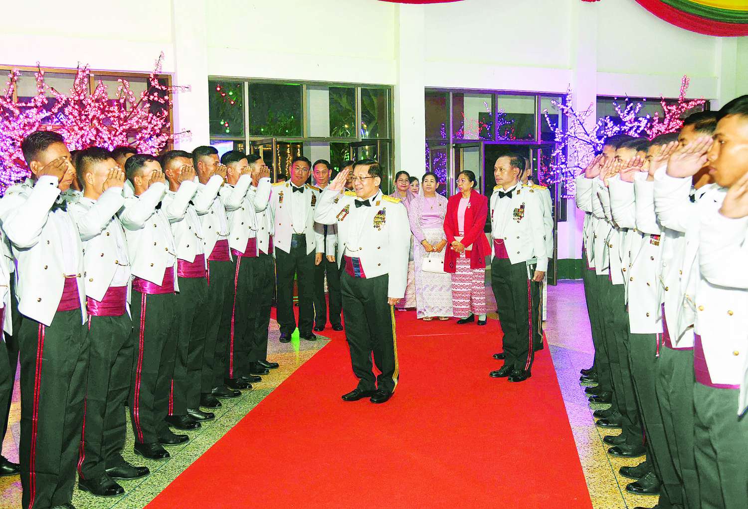 စစ်တက္ကသိုလ် ဗိုလ်လောင်းသင်တန်းအမှတ်စဉ် (၆၅) သင်တန်းဆင်း ဂုဏ်ပြုညစာ စားပွဲအခမ်းအနားကို ယနေ့ညနေပိုင်းတွင် ပြင်ဦးလွင်မြို့ စစ်တက္ကသိုလ် အနော်ရထာတပ်ရင်း ဗိုလ်လောင်းစားရိပ်သာ၌ ကျင်းပပြုလုပ်ရာ နိုင်ငံတော်စီမံအုပ်ချုပ်ရေးကောင်စီဥက္ကဋ္ဌ တပ်မတော်ကာကွယ်ရေးဦးစီးချုပ် ဗိုလ်ချုပ်မှူးကြီး မင်းအောင်လှိုင် တက်ရောက်ချီးမြှင့်သည်။