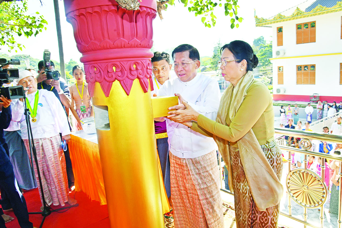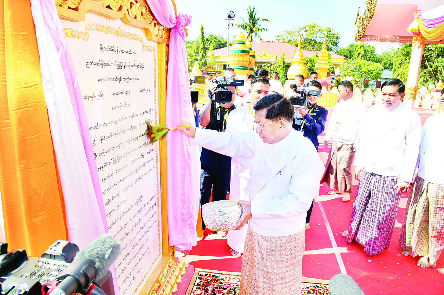 ယင်းနောက် နိုင်ငံတော်စီမံအုပ်ချုပ်ရေးကောင်စီဥက္ကဋ္ဌ နိုင်ငံတော်ဝန်ကြီးချုပ်နှင့် ဇနီးတို့က မဟာဗောဓိညောင်ပင်တော်ကြီး ပိုမို၍ တည်တံ့ခိုင်မြဲဝေစည်ရှင်သန်နိုင်စေရန်ရည်သန်၍ ပူဇော်ကြပြီး အမွှေးနံ့သာရည်များ ပက်ဖျန်းပူဇော်ကြကာ မင်္ဂလာမော်ကွန်းကမ္ပည်းကျောက်စာတော်ကို အမွှေးနံ့သာရည်များပက်ဖျန်း ဖွင့်လှစ်၍ ရတနာရွှေခေါင်းလောင်းတော်ကို ထိုးခတ်ပူဇော်သည်။