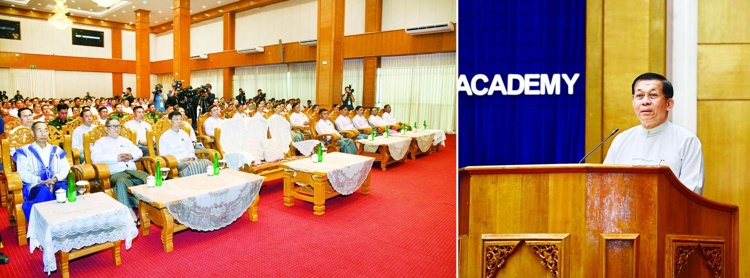 (၂၃) ကြိမ်မြောက် ဝိဇ္ဇာနှင့် သိပ္ပံ သုတေသနညီလာခံဖွင့်ပွဲအခမ်းအနားကို ယနေ့နံနက်ပိုင်းတွင် နေပြည်တော်ရှိ Naypyitaw State Academy ၌ ကျင်းပပြုလုပ်ရာ နိုင်ငံတော်စီမံအုပ်ချုပ်ရေးကောင်စီဥက္ကဋ္ဌ နိုင်ငံတော်ဝန်ကြီးချုပ် ဗိုလ်ချုပ်မှူးကြီး မင်းအောင်လှိုင် တက်ရောက်အမှာစကားပြောကြားသည်။