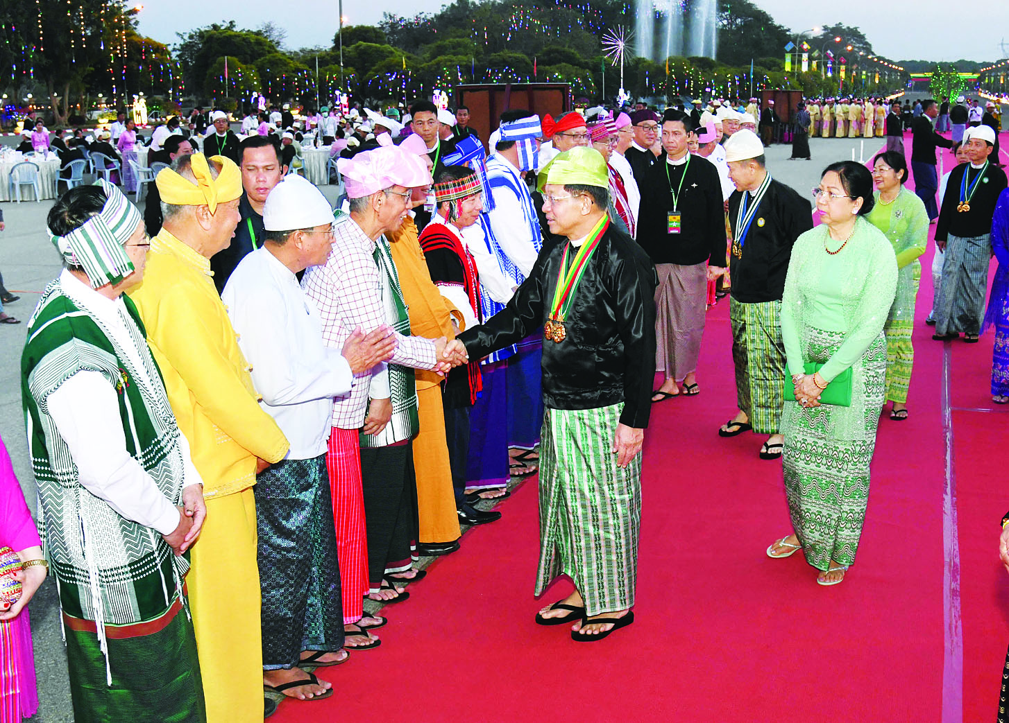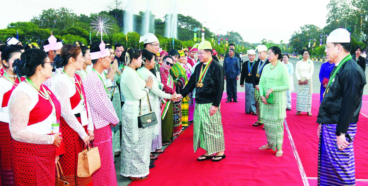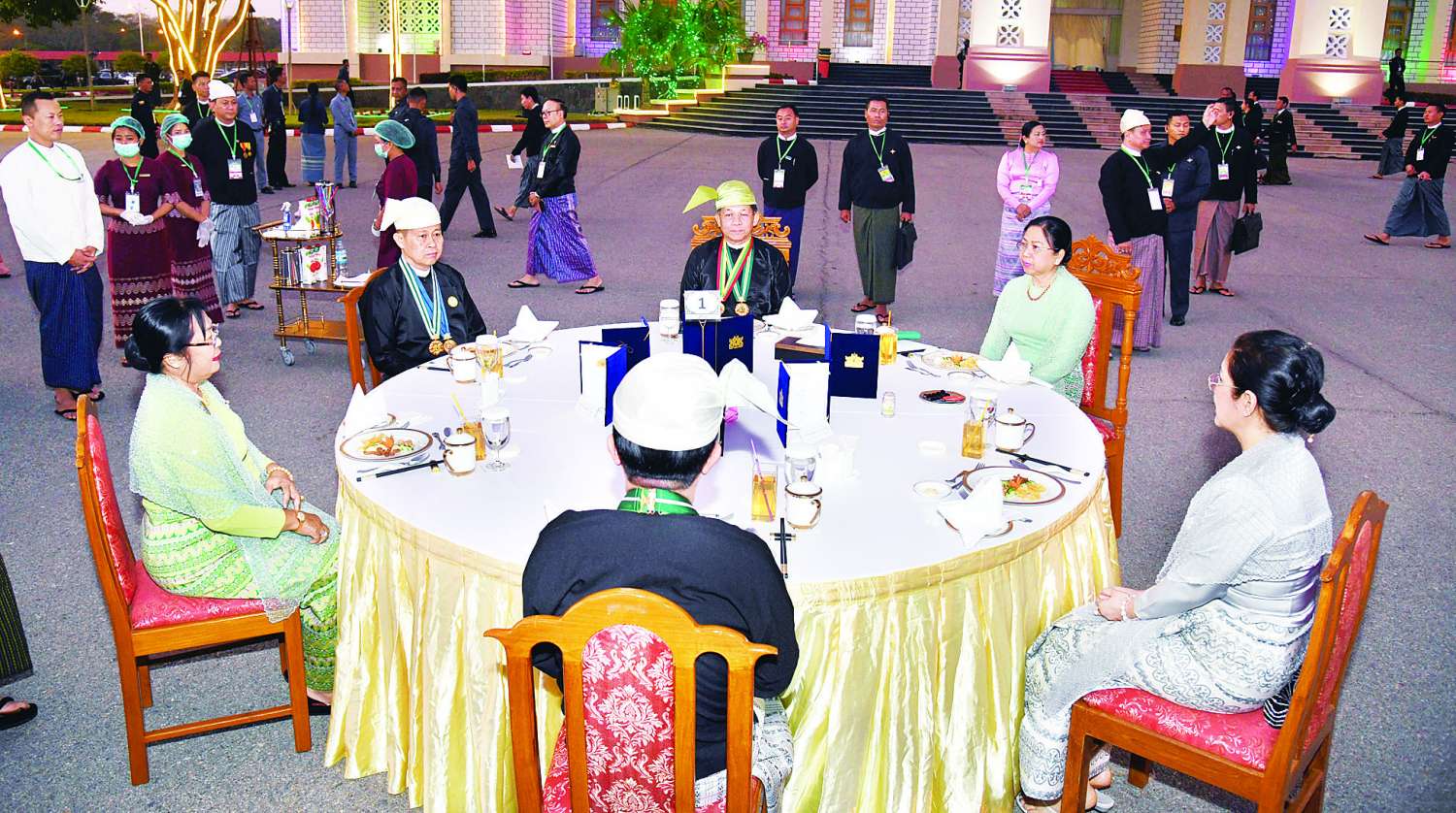 ထို့နောက် နိုင်ငံတော်စီမံအုပ်ချုပ်ရေးကောင်စီဥက္ကဋ္ဌ နိုင်ငံတော်ဝန်ကြီးချုပ်နှင့် ဇနီး၊ ကောင်စီဒုတိယဥက္ကဋ္ဌ ဒုတိယဝန်ကြီးချုပ်နှင့် ဇနီးတို့သည် ဂုဏ်ပြုညစာစားပွဲသို့ တက်ရောက်လာကြသည့် တိုင်းဒေသကြီးနှင့် ပြည်နယ်များမှ တိုင်းရင်းသားရိုးရာယဉ်ကျေးမှုအဖွဲ့များ၊ နိုင်ငံရေးပါတီများမှ ဥက္ကဋ္ဌများနှင့် ကိုယ်စားလှယ်များ၊ NCA စာချုပ် လက်မှတ်ရေးထိုးထားသည့် တိုင်းရင်းသားလက်နက်ကိုင်အဖွဲ့အစည်းများမှ ခေါင်းဆောင်များနှင့် ကိုယ်စားလှယ်များ၊ တိုင်းဒေသကြီးနှင့် ပြည်နယ်များမှ စီးပွားရေးရာဝန်ကြီးများနှင့် တိုင်းရင်းသားလူမျိုးရေးရာဝန်ကြီးများ၊ တိုင်းဒေသကြီးနှင့် ပြည်နယ်များမှ MSME လုပ်ငန်းရှင်များ၊ ကာကွယ်ရေးဦးစီးချုပ်ရုံးမှ အဆင့်မြင့်တပ်မတော်အရာရှိကြီးများနှင့် ဇနီးများ၊ ပြည်ထောင်စုဝန်ကြီးများ၊ ပြည်ထောင်စုအဆင့်ပုဂ္ဂိုလ်များနှင့် ဇနီးများ၊ နိုင်ငံတော်စီမံအုပ်ချုပ်ရေးကောင်စီဝင်များနှင့် ဇနီးများ၊ ကောင်စီအတွင်းရေးမှူးနှင့် ဇနီးတို့ကို ရင်းရင်းနှီးနှီး လိုက်လံနှုတ်ဆက်ကြသည်။