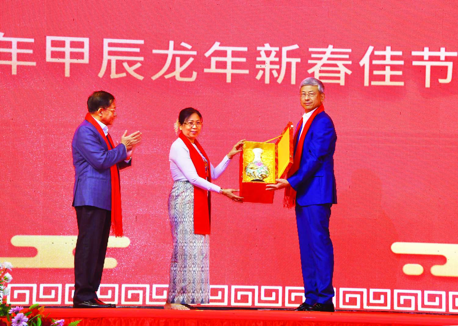 ယင်းနောက် မြန်မာနိုင်ငံဆိုင်ရာ တရုတ်နိုင်ငံ သံအမတ်ကြီးက နှစ်သစ်ဆုတောင်းစကားပြောကြားရာတွင် ယခုကဲ့သို့ (၂၀၂၄) ခုနှစ် ရွှေနဂါးတရုတ် နှစ်သစ်ကူးပွဲတော်သို့ နိုင်ငံတော်စီမံအုပ်ချုပ်ရေး ကောင်စီဥက္ကဋ္ဌ နိုင်ငံတော်ဝန်ကြီးချုပ်နှင့် ဇနီးတို့မှ အဖွဲ့ဝင်များနှင့်အတူ တက်ရောက်ချီးမြှင့်ပေးသည့်အတွက် အထူးပင်ကျေးဇူးတင်ရှိပါကြောင်း၊ ဧည့်သည်တော်များအားလုံး နှစ်သစ်အခါသမယတွင် နဂါးကဲ့သို့ တင့်တယ်ခြင်း၊ အားမာန်ပြည့်ဝခြင်းတို့ဖြင့် တိုးတက်ကြပါစေရန် ဆုမွန်ကောင်းတောင်းပါကြောင်း၊ ပြီးခဲ့သည့်နှစ်များအတွင်း တရုတ်-မြန်မာ နှစ်နိုင်ငံအကြား ကဏ္ဍအသီးသီး၌ အတူတကွ ကြိုးပမ်းဆောင်ရွက်ခဲ့ကြသောကြောင့် ယုံကြည်မှုများနှင့် ချစ်ကြည်ရင်းနှီးမှုများ ပိုမိုတိုးမြှင့်ခိုင်မာအောင် တည်ဆောက်နိုင်ခဲ့ပါကြောင်း၊ နှစ်သစ်တွင် နှစ်နိုင်ငံနှင့် နှစ်နိုင်ငံရှိ ပြည်သူများအနေဖြင့် ငြိမ်းချမ်းခြင်း၊ ချစ်ခင်ခြင်း၊ အပြန်အလှန်လေးစားခြင်းတို့ဖြင့် ပြည့်ဝပြီး နှစ်နိုင်ငံအကျိုးအတွက် ဆောင်ရွက်နိုင်ကြပါစေကြောင်း၊ နှစ်နိုင်ငံအကြား ဆွေမျိုးပေါက်ဖော်ချစ်ကြည်ရေး အဓွန့်ရှည်ခိုင်မြဲပါစေကြောင်းနှင့် တရုတ် - မြန်မာလူသားမျိုးနွယ်များ တိုးတက်မှုအတွက် အတူတကွ ကြိုးပမ်းသွားကြမည်ဖြစ်ပါကြောင်းဖြင့် ဆုမွန်ကောင်းစကား ပြောကြားသည်။