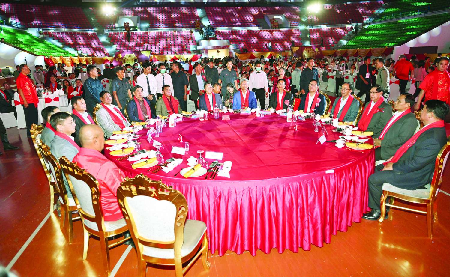 (၂၀၂၄) ခုနှစ် ရွှေနဂါးတရုတ်နှစ်သစ်ကူးပွဲတော်အခမ်းအနားကို ယနေ့ညနေပိုင်းတွင် ရန်ကုန်မြို့ရှိ အမျိုးသားအားကစားပြိုင်ပွဲရုံ (၁) သုဝဏ္ဏ၌ ကျင်းပပြုလုပ်ရာ နိုင်ငံတော်စီမံအုပ်ချုပ်ရေးကောင်စီဥက္ကဋ္ဌ နိုင်ငံတော်ဝန်ကြီးချုပ် ဗိုလ်ချုပ်မှူးကြီး မင်းအောင်လှိုင်နှင့် ဇနီး ဒေါ်ကြူကြူလှတို့ တက်ရောက်ချီးမြှင့်သည်။