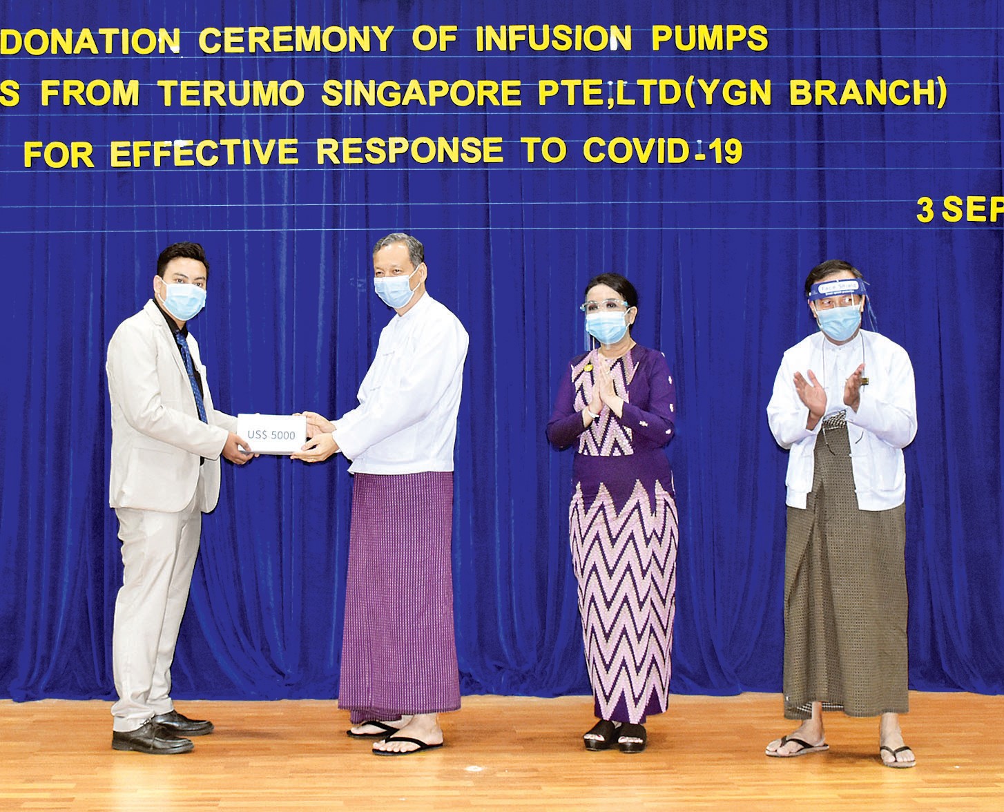 ယနေ့လှူဒါန်းပွဲတွင် ကျန်းမာရေးနှင့် အားကစားဝန်ကြီးဌာန က ကိုဗစ်-၁၉ ရောဂါ ကာကွယ် ထိန်းချုပ်ကုသရေး လုပ်ငန်းများ တွင် အသုံးပြုရန်အတွက် TERUMO SINGAPORE PTE, LTD (ရန်ကုန်ရုံးခွဲ)က အမေရိကန်ဒေါ်လာ ၅၀၀ဝ တန်ဖိုးရှိ Infusion Pumps ငါးလုံးကို လှူဒါန်းခဲ့ခြင်းဖြစ်သည်။
