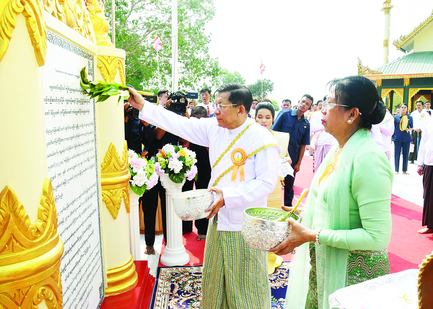ယင်းနောက် နိုင်ငံတော်စီမံအုပ်ချုပ်ရေးကောင်စီဥက္ကဋ္ဌ နိုင်ငံတော်ဝန်ကြီးချုပ်နှင့် ဇနီးတို့က မင်္ဂလာမော်ကွန်းကျောက်စာတော်အား ပရိတ်နံ့သာရည်များဖြင့် ပက်ဖျန်းဖွင့်လှစ်ပြီး ခေါင်းလောင်းတော်အား ကိုးချက်ထိုးခတ်ပူဇော်ကာ မေတ္တာပြု၍ နိုင်ငံတော်စီမံအုပ်ချုပ်ရေးကောင်စီဥက္ကဋ္ဌ နိုင်ငံတော်ဝန်ကြီးချုပ်သည် ရှေးဟောင်းသမိုင်းဝင် ကျိုက်ပညာယျစေတီတော်မြတ်ကြီး၏ ဧည့်သည်တော် မှတ်တမ်းစာအုပ်တွင် မှတ်တမ်းတင် လက်မှတ်ရေးထိုးပူဇော်သည်။ ဆက်လက်၍ နိုင်ငံတော်စီမံအုပ်ချုပ်ရေးကောင်စီဥက္ကဋ္ဌ နိုင်ငံတော်ဝန်ကြီးချုပ်နှင့် ဇနီးတို့က တံခွန်တိုင်ကို ပရိတ်နံ့သာရည်များ ပက်ဖျန်း၍ ဖွင့်လှစ်ပေးသည်။