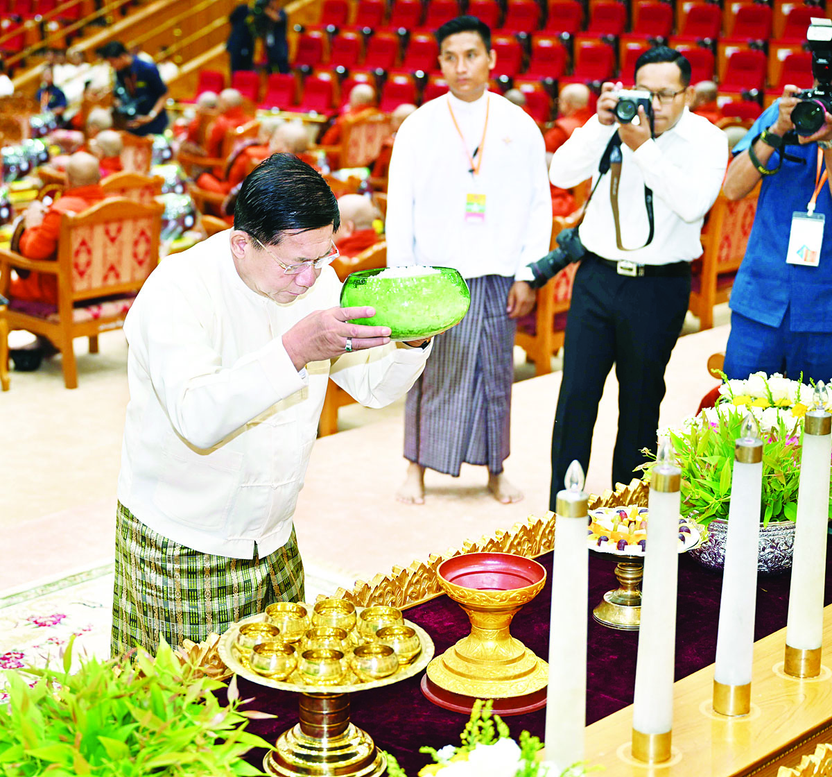 အခမ်းအနားမစတင်မီ နိုင်ငံတော်စီမံအုပ်ချုပ်ရေးကောင်စီဥက္ကဋ္ဌ နိုင်ငံတော်ဝန်ကြီးချုပ်က အဂ္ဂါဓိပတိသာသနာ့ ဗိမာန်တော်ကြီးအတွင်းရှိ မာရဝိဇယနောင်တော်ကြီး ဗုဒ္ဓရုပ်ပွားတော်မြတ်အား မြသပိတ်ဆွမ်းတော်၊ သစ်သီး၊ ပန်းမန်၊ သောက်တော်ရေချမ်းနှင့် ဆီမီးကပ်လှူပူဇော်သည်။