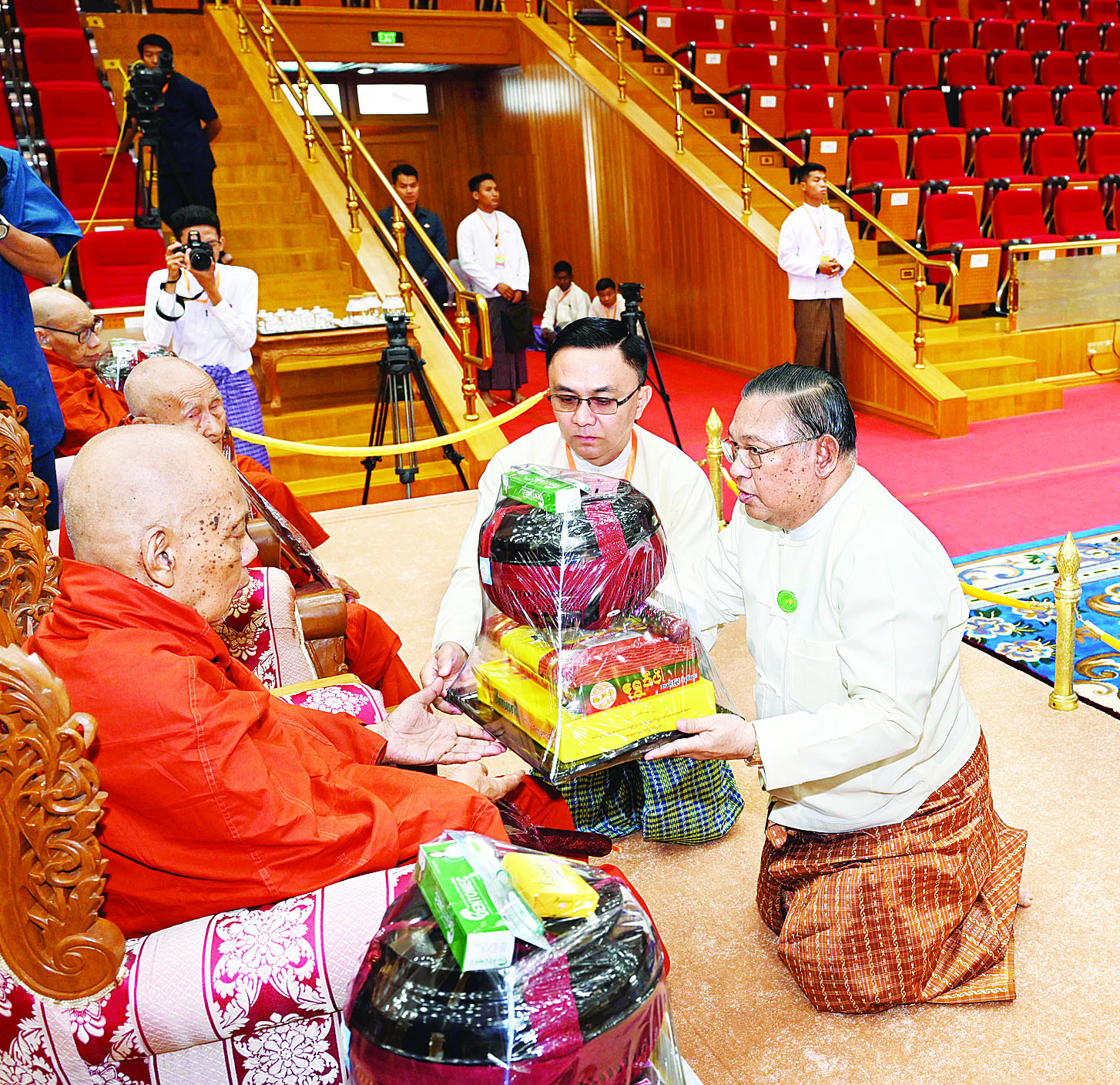 ယင်းနောက် နိုင်ငံတော်စီမံအုပ်ချုပ်ရေးကောင်စီဥက္ကဋ္ဌ နိုင်ငံတော်ဝန်ကြီးချုပ်နှင့် ဇနီးတို့က နိုင်ငံတော်သံဃမဟာနာယက အဖွဲ့ဥက္ကဋ္ဌ သန်လျင်မင်းကျောင်းဆရာတော် ဘုရားကြီးထံသို့လည်းကောင်း၊ ကောင်စီဒုတိယဥက္ကဋ္ဌ ဒုတိယဝန်ကြီးချုပ်နှင့် ဇနီးတို့က နိုင်ငံတော်သံဃမဟာ နာယကအဖွဲ့ အကျိုးတော်ဆောင်၊ မန္တလေးမြို့၊ မစိုးရိမ်တိုက်သစ် မဟာနာယက ဆရာတော်ကြီးထံသို့လည်းကောင်း၊ ကောင်စီ အတွင်းရေးမှူးနှင့် ဇနီး၊ တွဲဖက်အတွင်းရေးမှူးနှင့် ဇနီး၊ ကောင်စီအဖွဲ့ဝင်များနှင့်ဇနီးများ၊ အခမ်းအနားသို့ တက်ရောက်လာသည့် အကြီးအကဲများက သာသနာတော်ဆိုင်ရာ ဘွဲ့တံဆိပ်တော်ဆက်ကပ်ခံယူမည့် ဆရာတော်ကြီးများထံသို့လည်းကောင်း လှူဖွယ်ဝတ္ထုပစ္စည်းများကို ဆက်ကပ်လှူဒါန်းကြသည်။