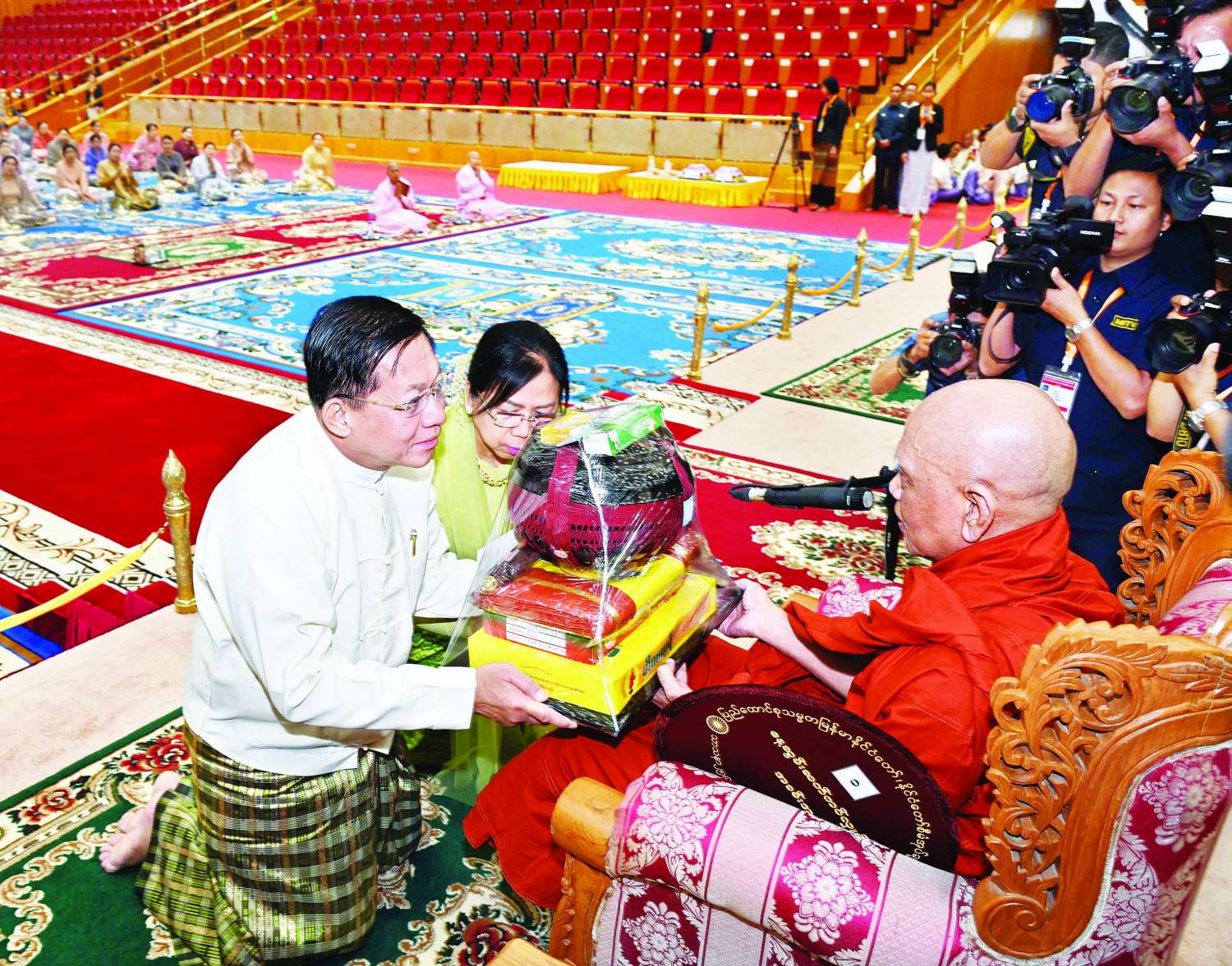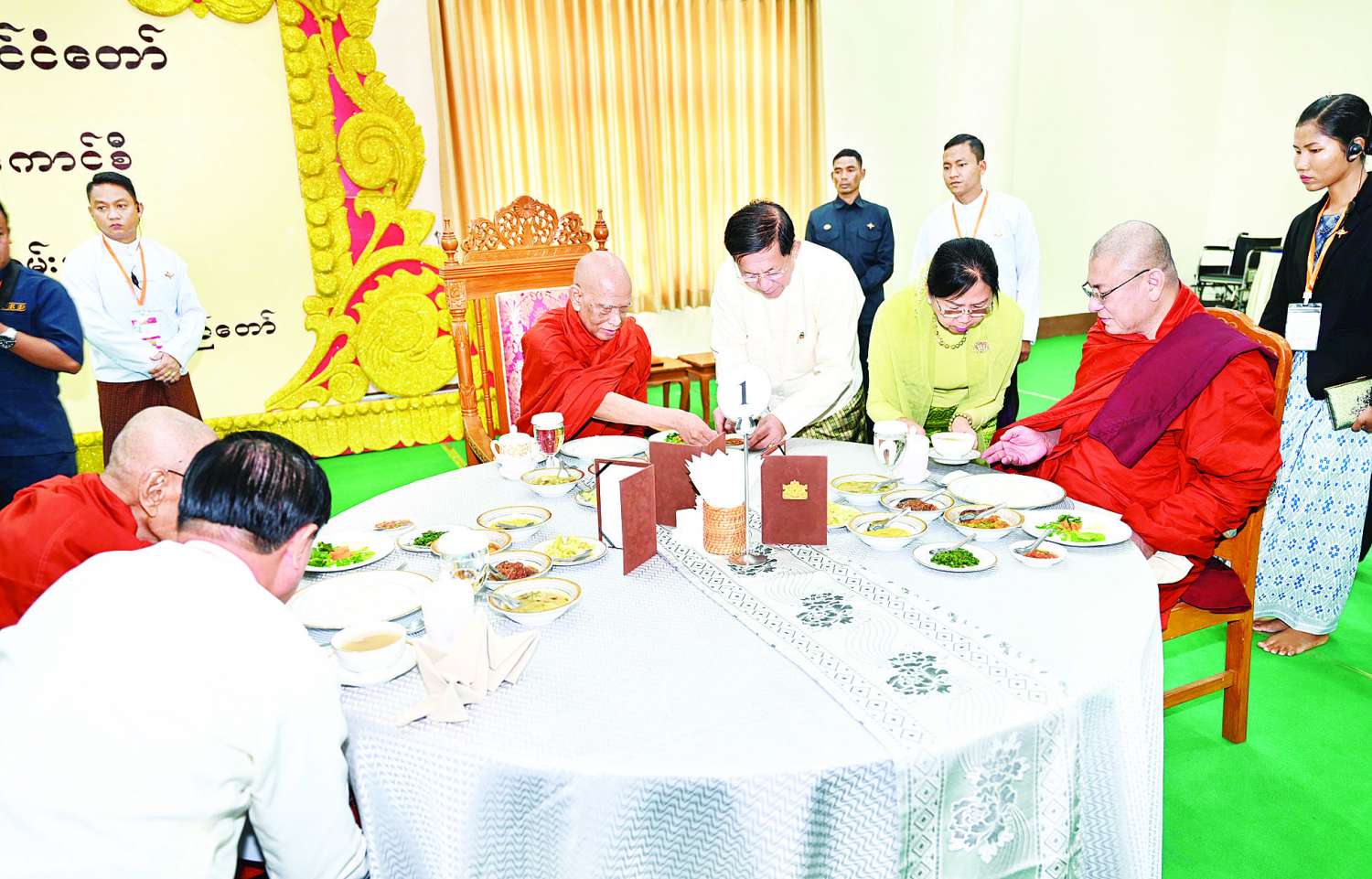 ၂၀၂၄ ခုနှစ်၊ သာသနာတော်ဆိုင်ရာ ဘွဲ့တံဆိပ်တော် ဆက်ကပ်ခံယူတော်မူမည့် ဆရာတော်ကြီးများအား နိုင်ငံတော်စီမံအုပ်ချုပ်ရေးကောင်စီဥက္ကဋ္ဌ နိုင်ငံတော်ဝန်ကြီးချုပ် ဗိုလ်ချုပ်မှူးကြီး မင်းအောင်လှိုင်နှင့် ဇနီး ဒေါ်ကြူကြူလှတို့က ယနေ့နံနက်ပိုင်းတွင် နေပြည်တော် မာရဝိဇယဗုဒ္ဓဥယျာဉ်တော် ပရိဝုဏ်အတွင်းရှိ အဂ္ဂါဓိပတိသာသနာ့ ဗိမာန်တော်ကြီး၌ နေ့ဆွမ်းဆက်ကပ်လှူဒါန်းသည်။