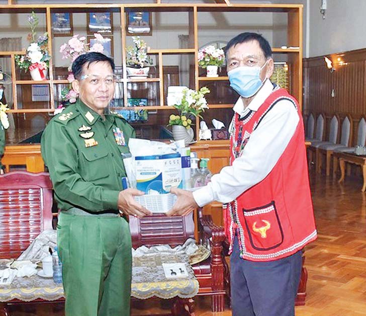 ယင်းနောက် တပ်မတော်ကာကွယ်ရေးဦးစီးချုပ်က UWSA “ဝ” အဖွဲ့အတွက် ကိုဗစ် - ၁၉ ရောဂါ ကာကွယ် ထိန်းချုပ် ကုသရေးလုပ်ငန်း အထောက်အကူပြု ပစ္စည်းများဖြစ်သည့် Surgical Mask ၂၀၀၀၀၊ Personal Protective Equipment (PPE) ဝတ်စုံ ၃၀၀၊ N 95 Mask ၁၀၀၀၊ Face Shield၂၅၀၊ Sodium Hypochloride (15L) ၆ ပုံး၊ Examination Glove ၁၀၀၀၊ Hand Gel ဘူး ၁၅၀၊ Hand Sanitizer ၁၅၀ နှင့် စားသောက်ဖွယ်ရာများ၊ တပ်မတော်စက်ရုံထုတ် စားသောက် ဖွယ်ရာများနှင့် လူသုံးကုန်ပစ္စည်းများကို ပေးအပ်လှူဒါန်းရာ ဦးညီကပ်နှင့် အဖွဲ့ဝင်များက လက်ခံရယူပြီး UWSA “ဝ” အဖွဲ့က ဒေသထွက် လက်ဆောင်များကို ပြန်လည်ပေးအပ်သည်။