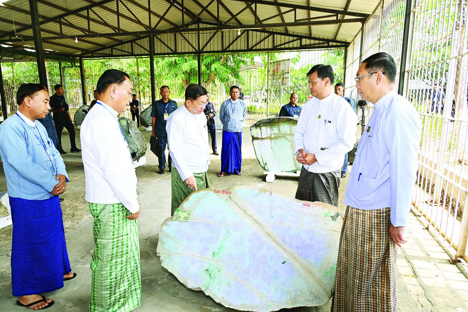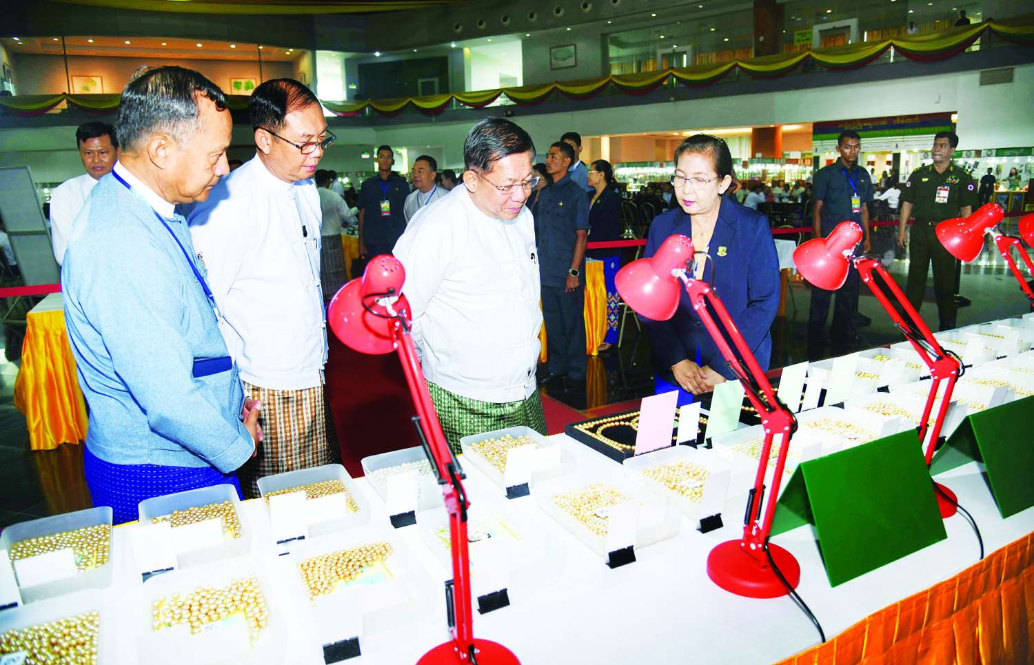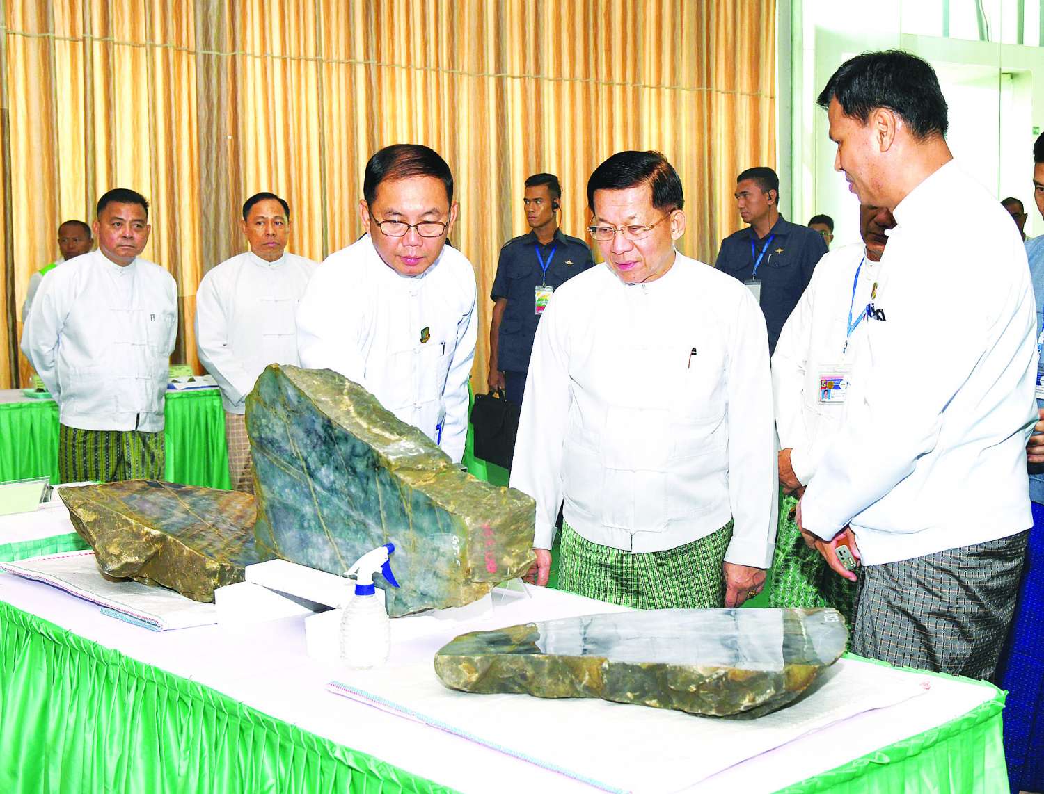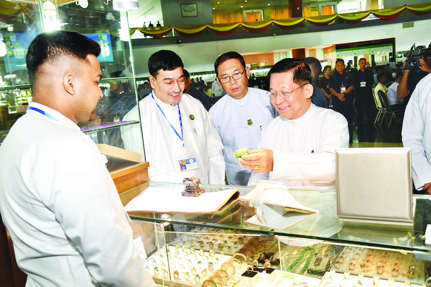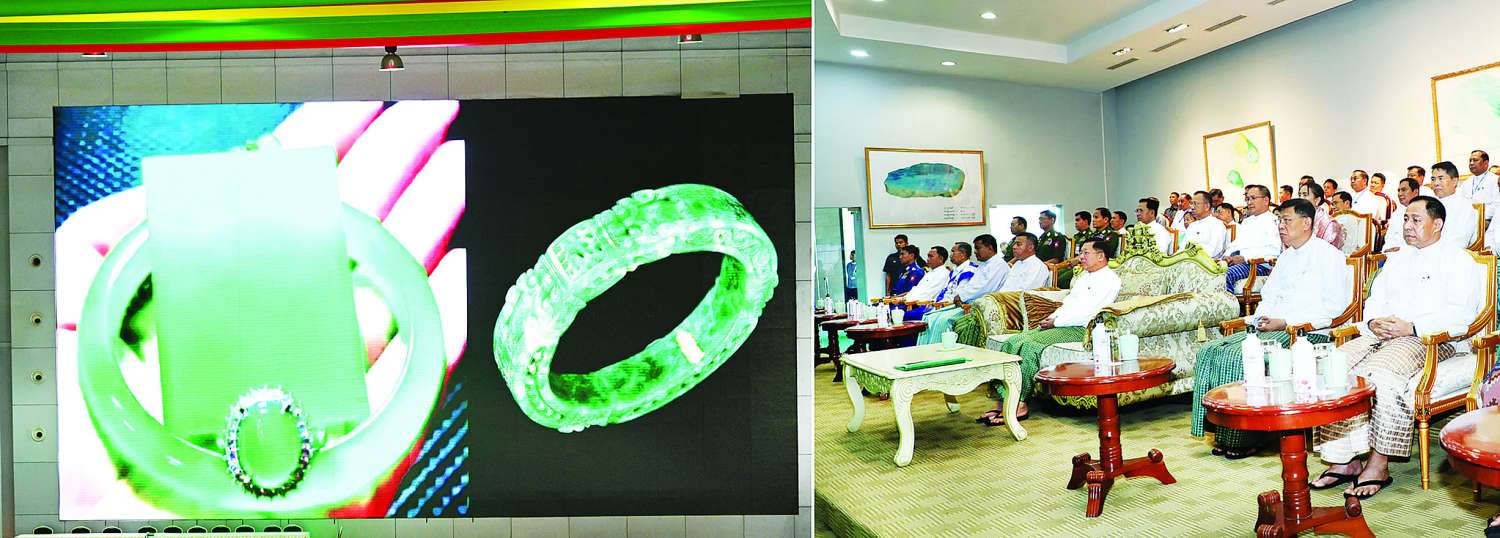 ထို့နောက် နိုင်ငံတော်စီမံအုပ်ချုပ်ရေးကောင်စီဥက္ကဋ္ဌ နိုင်ငံတော်ဝန်ကြီးချုပ်နှင့်အဖွဲ့ဝင်များသည် ပုဂ္ဂလိကကျောက်မျက်ရတနာအချောထည် အရောင်းပြခန်းများ ဖွင့်လှစ်ရောင်းချနေမှုကို လိုက်လံကြည့်ရှုအားပေးပြီး ခန်းမအပြင်ဘက်တွင် ခင်းကျင်းပြသထားသည့် ကျောက်စိမ်းရိုင်းအတွဲများကို လိုက်လံကြည့်ရှု စစ်ဆေးသည်။