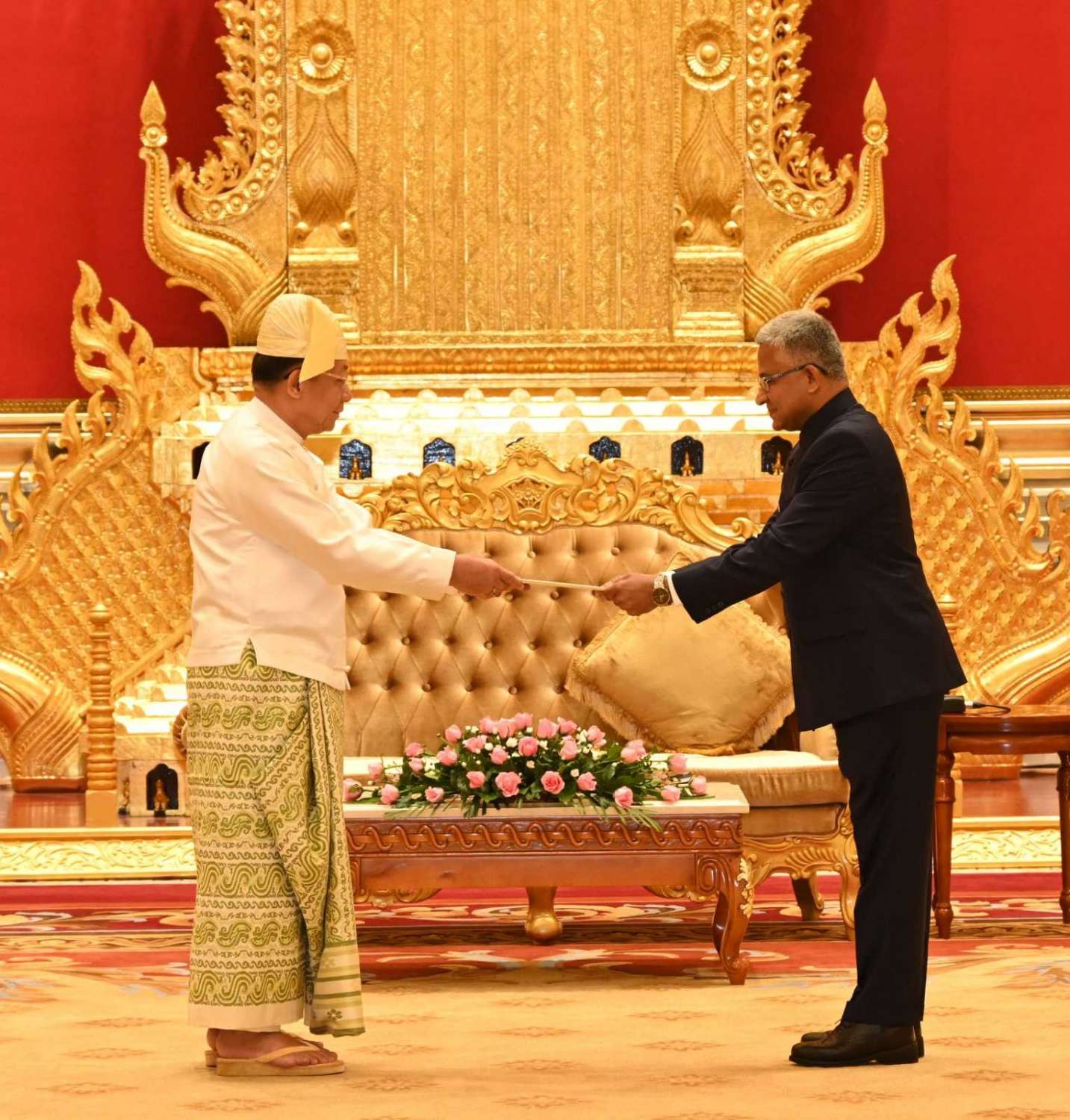 နိုင်ငံတော်စီမံအုပ်ချုပ်ရေးကောင်စီဥက္ကဋ္ဌ နိုင်ငံတော်ဝန်ကြီးချုပ် ဗိုလ်ချုပ်မှူးကြီး မင်းအောင်လှိုင်ထံ မြန်မာနိုင်ငံဆိုင်ရာ အိန္ဒိယနိုင်ငံသံအမတ်ကြီး သံအမတ်ခန့်အပ်လွှာပေးအပ်