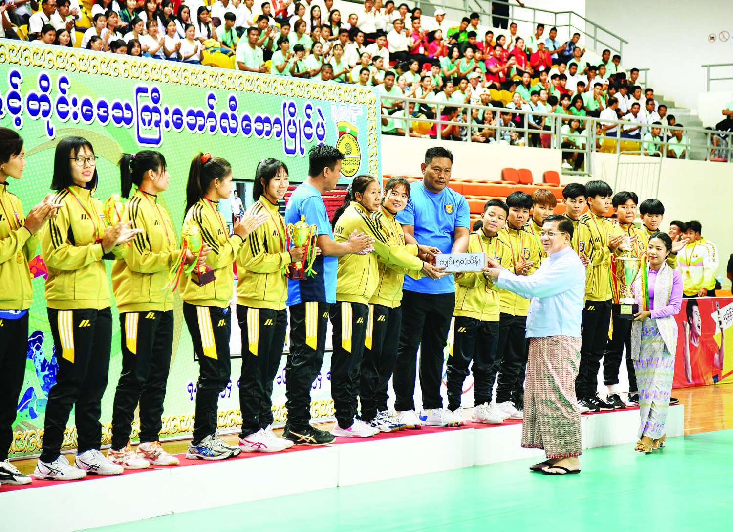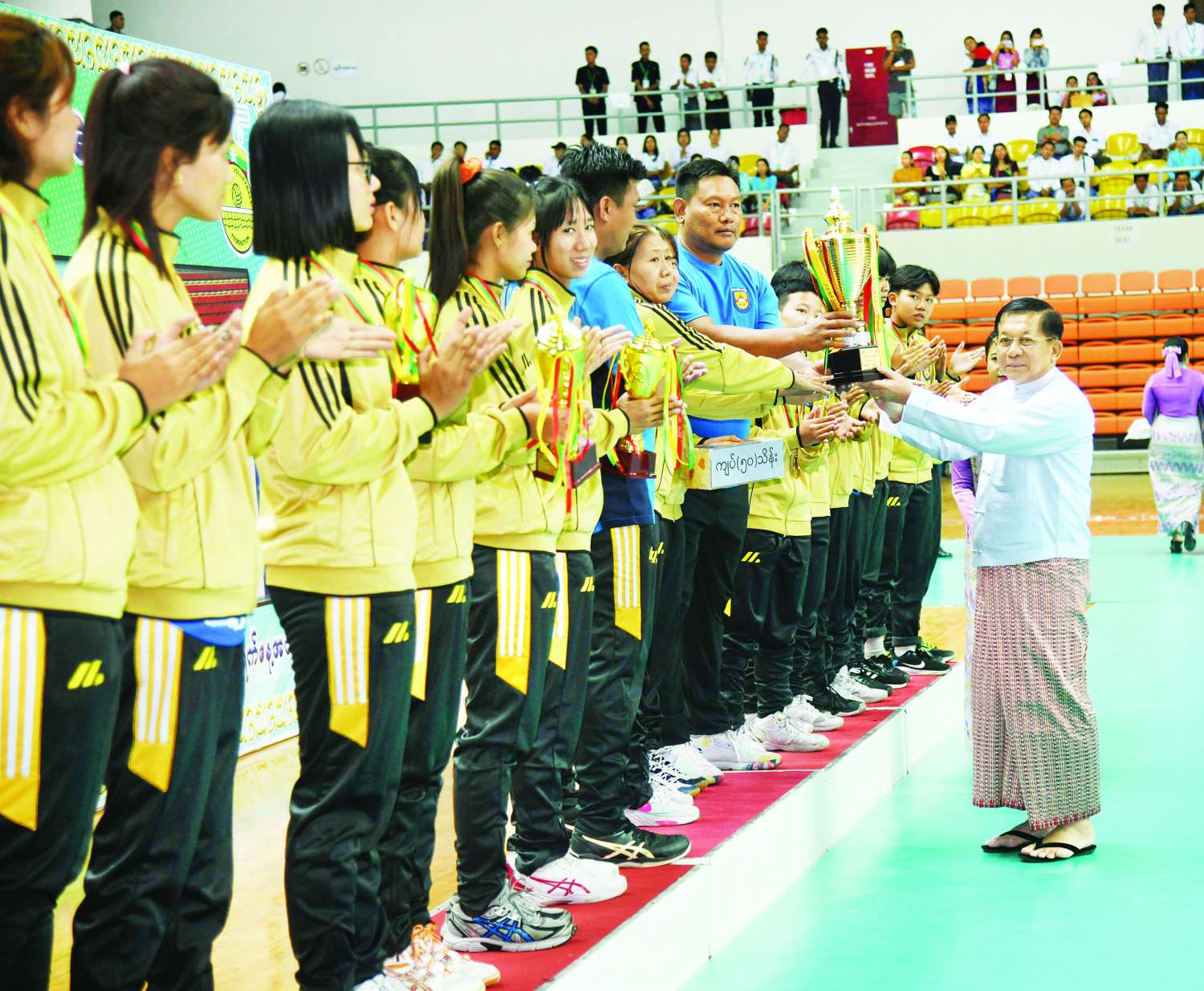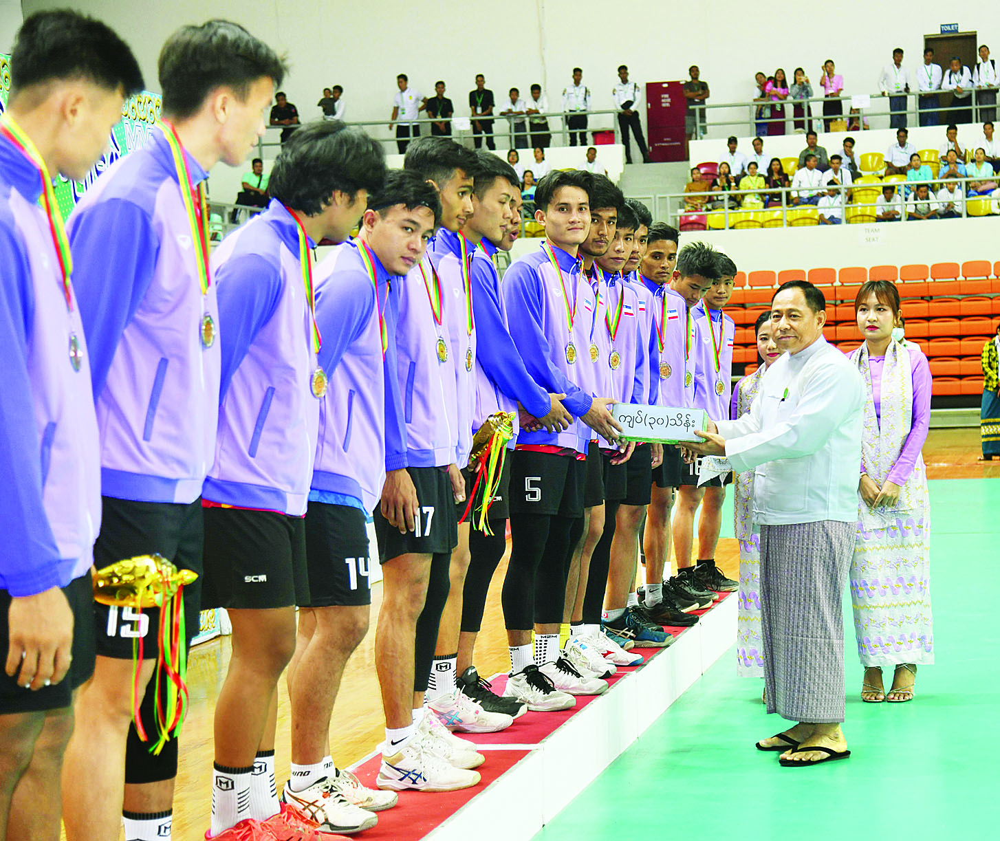 ထို့နောက် နိုင်ငံတော်စီမံအုပ်ချုပ်ရေးကောင်စီဥက္ကဋ္ဌ နိုင်ငံတော်ဝန်ကြီးချုပ် ဗိုလ်ချုပ်မှူးကြီး မင်းအောင်လှိုင်က ဘော်လီဘော(အမျိုးသား)ပြိုင်ပွဲတွင် ပထမဆုရရှိသည့် ရှမ်းပြည်နယ်အသင်းနှင့် ဘော်လီဘော(အမျိုးသမီး)ပြိုင်ပွဲတွင် ပထမဆုရရှိသည့် မန္တလေးတိုင်းဒေသကြီးအသင်းတို့အား ဂုဏ်ပြုချီးမြှင့်ငွေနှင့် တံခွန်စိုက်ဖလားတို့ကို ပေးအပ်ချီးမြှင့်ပြီး အားကစားသမားများကို ရင်းရင်းနှီးနှီးနှုတ်ဆက်ခဲ့ကြသည်။
