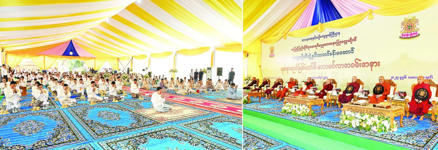 ဦးစွာ မဟာမင်္ဂလာအခမ်းအနားအစီအစဉ်ပထမပိုင်းကို “နမောတဿ” သုံးကြိမ်ရွတ်ဆိုဘုရားကန်တော့ဖွင့်လှစ်ပြီး နိုင်ငံတော်သံဃမဟာနာယကအဖွဲ့ အကျိုးတော်ဆောင် မစိုးရိမ်တိုက်သစ်ဆရာတော်ကြီးထံမှ နိုင်ငံတော်စီမံအုပ်ချုပ်ရေးကောင်စီဥက္ကဋ္ဌ နိုင်ငံတော်ဝန်ကြီးချုပ်နှင့် ဇနီးအမှူးပြုသည့် ဧည့်ပရိသတ်များက ငါးပါးသီလခံယူဆောက်တည်ကြသည်။