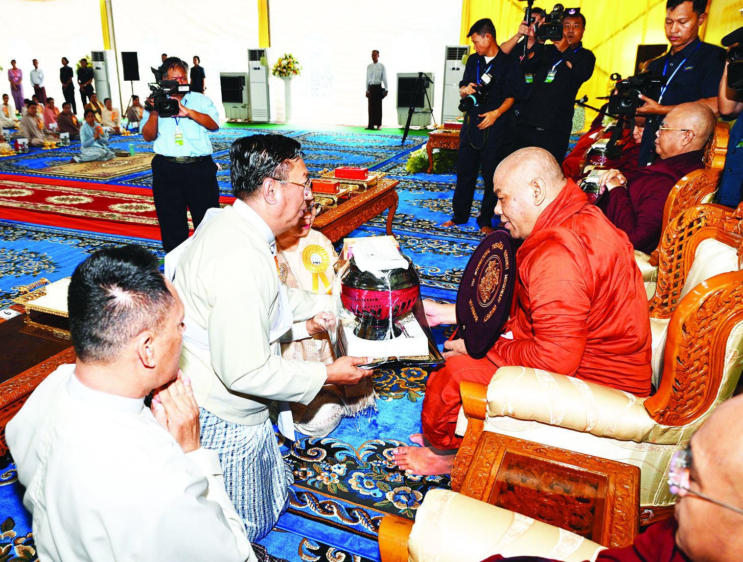 ယင်းနောက် နိုင်ငံတော်စီမံအုပ်ချုပ်ရေးကောင်စီဥက္ကဋ္ဌ နိုင်ငံတော်ဝန်ကြီးချုပ်နှင့် ဇနီး အခမ်းအနားတက်ရောက်လာကြသူများက ဆရာတော်ကြီးများကို နေ့ဆွမ်းဆက် ကပ်လှူဒါန်းခဲ့ကြသည်။