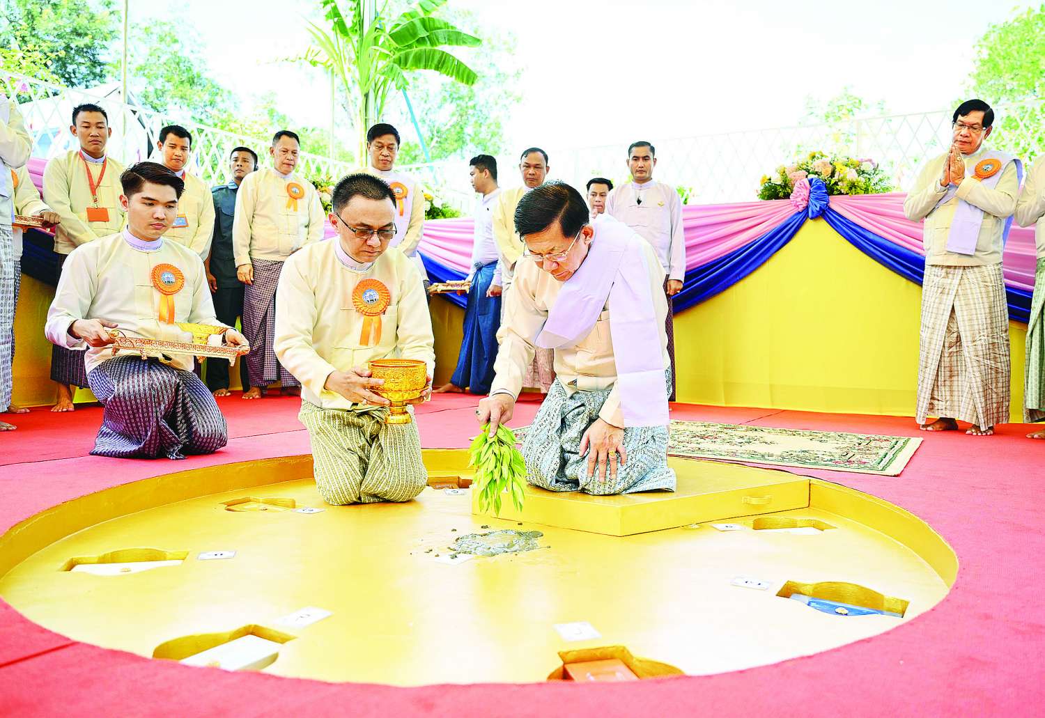 ထို့နောက် ဦးဆောင်အလှူဒါယိကာ နိုင်ငံတော်စီမံအုပ်ချုပ်ရေးကောင်စီဥက္ကဋ္ဌ နိုင်ငံတော်ဝန်ကြီးချုပ်က ခန်းမဆောင်အလယ်ဗဟိုချက်တည့်တည့်ရှိ ပတ္တမြား ရတနာအုတ်မြစ်တော်အား မြေသရွတ်တော်ဖြင့် အခိုင်အခန့်ပြုလုပ်ကာ ပရိတ်နံ့သာရည်များ ပတ်ဖျန်းပေးသည်။ ယင်းနောက် ကြွရောက်တော်မူကြသည့် ဆရာတော်၊ သံဃာတော်များ၊ ဦးဆောင်အလှူဒါယိကာ နိုင်ငံတော်စီမံအုပ်ချုပ်ရေးကောင်စီဥက္ကဋ္ဌ နိုင်ငံတော်ဝန်ကြီးချုပ်နှင့် ဇနီး အမှူးပြုသည့် ဧည့်ပရိတ်သတ်များက “ဇယန္တော ဗောဓိယာမူလေ” အစချီနှစ်ဂါထာကို ရွတ်ဆိုပူဇော်ကြပြီး ရတနာအုတ်မြစ်တော်စီအခမ်းအနားကို “ဗုဒ္ဓသာသနံ စိရံတိဋ္ဌတု” သုံးကြိမ်ရွတ်ဆိုဆုတောင်း၍ အခမ်းအနားကို ရုပ်သိမ်းလိုက်သည်။