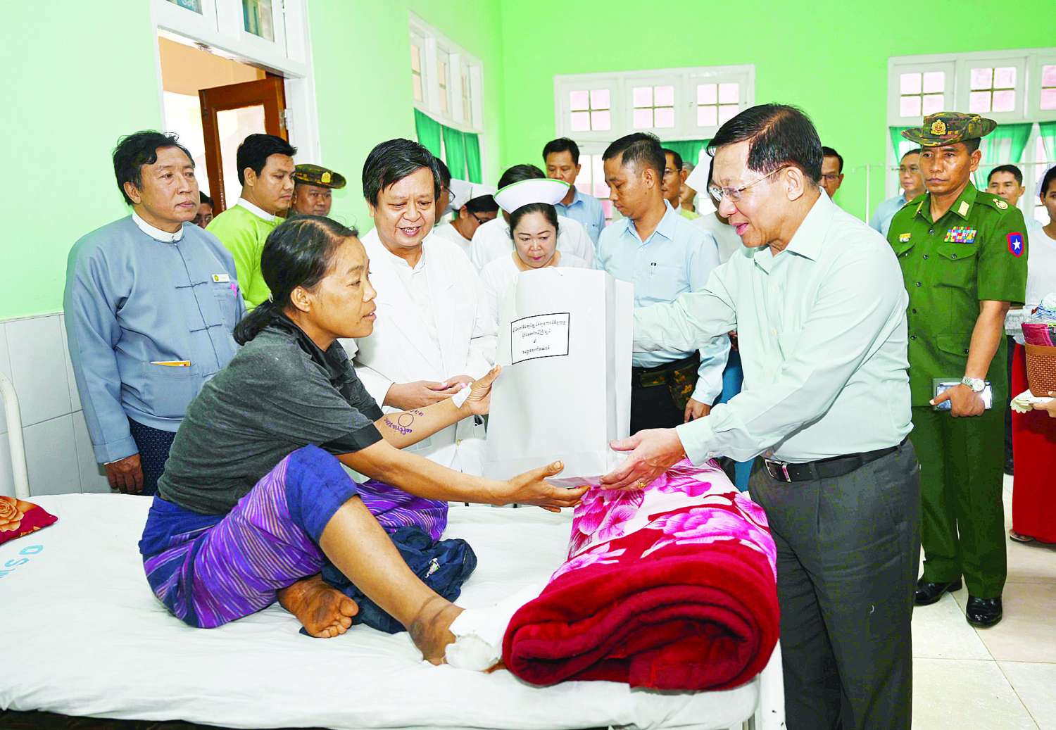 ယင်းနောက် နိုင်ငံတော်စီမံအုပ်ချုပ်ရေးကောင်စီဥက္ကဋ္ဌ နိုင်ငံတော်ဝန်ကြီးချုပ်နှင့် အဖွဲ့ဝင်များသည် ပြင်ဦးလွင်မြို့၊ အထွေထွေရောဂါကုပြည်သူ့ဆေးရုံကြီးသို့ ရောက်ရှိကြရာ ဆေးရုံအုပ် ဒေါက်တာသိန်းထွန်းနှင့် ကျန်းမာရေးဝန်ထမ်းများက ကြိုဆိုနှုတ်ဆက်ကြသည်။ ဆက်လက်၍ နိုင်ငံတော်စီမံအုပ်ချုပ်ရေးကောင်စီဥက္ကဋ္ဌ နိုင်ငံတော်ဝန်ကြီးချုပ်သည် ဧပြီ ၁၄ ရက် ညပိုင်းတွင် အကြမ်းဖက်သောင်းကျန်းသူများ၏ ရှော့တိုက်ဒုံးဖြင့် ပစ်ခတ်တိုက်ခိုက်မှုကြောင့် ထိခိုက်ပျက်စီးခဲ့ရသည့် အရိုးအကြောကုသဆောင်ပြင်ဆင်ထားရှိမှုနှင့် အဆိုပါကုသဆောင်တွင် တက်ရောက်ဆေးကုသမှုခံယူလျက်ရှိသည့် ဒေသခံပြည်သူများ၏ ကျန်းမာရေးအခြေအနေများကို တစ်ဦးချင်း ရင်းရင်းနှီးနှီး မေးမြန်းအားပေးစကားပြောကြားကာ ထောက်ပံ့ပစ္စည်းများ ပေးအပ်ခဲ့သည်။