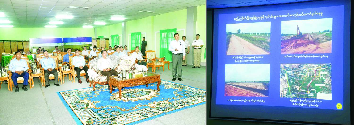 ဦးစွာ နိုင်ငံတော်စီမံအုပ်ချုပ်ရေးကောင်စီဥက္ကဋ္ဌ နိုင်ငံတော်ဝန်ကြီးချုပ်အား မွေးမြူရေးဇုန်ရှင်းလင်းဆောင်၌ မြန်မာစီးပွားရေးကော်ပိုရေးရှင်းဥက္ကဋ္ဌ ဒုတိယဗိုလ်ချုပ်ကြီး ညိုစောနှင့် တာဝန်ရှိသူများက ရွှေပြည်စိုက်ပျိုးမွေးမြူရေးဇုန် အကောင်အထည် ဖော်ဆောင်ရွက်လျက်ရှိမှု၊ သီလဝါဘက်စုံ စိုက်ပျိုးမွေးမြူရေးဇုန်နှင့် ၂၆ မိုင် ဘက်စုံစိုက်ပျိုးမွေးမြူရေးဇုန်တို့၏ လုပ်ငန်းဆောင်ရွက်နေမှုအခြေအနေများ၊ နိုင်ငံတော်စီမံအုပ်ချုပ်ရေးကောင်စီဥက္ကဋ္ဌ နိုင်ငံတော်ဝန်ကြီးချုပ်၏ လမ်းညွှန်ချက်များကို အကောင်အထည်ဖော် ဆောင်ရွက်နေမှုအခြေအနေများ၊ ဘက်စုံစိုက်ပျိုးမွေးမြူရေးဇုန်များ အကောင်အထည်ဖော်ဆောင်ရွက်ခဲ့မှုနှင့် ဆောင်ရွက်ပြီးစီးပြီး လုပ်ငန်းလည်ပတ်နေမှုအခြေအနေများ၊ ငါး၊ ဥစားဘဲ၊ ဥစားကြက်၊ အသားတိုးကြက်၊ နို့စားနွား၊ အသားစားနွား၊ အသားတိုးဝက် စသည့်မွေးမြူရေးလုပ်ငန်းများ ဆောင်ရွက်ရာတွင် အထွက်နှုန်းတိုးတက်မြင့်မားစေရေး၊ မျိုးကောင်းမျိုးသန့်များ ရွေးချယ်မွေးမြူခြင်း၊ ခေတ်မီစက်ယန္တရားများ အသုံးပြုမွေးမြူခြင်း၊ သားဖောက်မွေးမြူခြင်းများဆောင်ရွက်လျက်ရှိပြီး အစာပြည့်စုံကောင်းမွန်မှုရှိစေရေးစီမံဆောင်ရွက်လျက်ရှိသည့် အခြေအနေများ၊ ထွက်ရှိလာသည့် စိုက်ပျိုးမွေးမြူရေးထွက်ကုန်များကို ဈေးကွက်အတွင်းသို့ ဖြန့်ဖြူးလျက်ရှိသည့် အခြေအနေများ၊ မွေးမြူရေးဇုန်များ၌ အစာစပ်လုပ်ငန်းနှင့် အစာတောင့်စက်များ ထုတ်လုပ်လျက်ရှိမှု၊ နို့ထွက်ပစ္စည်းများ ထုတ်လုပ်ရောင်းချလျက်ရှိမှု အခြေအနေများ၊ ရော်ဘာစိုက်ပျိုးရေး စီမံကိန်းအကောင်အထည်ဖော် ဆောင်ရွက်လျက်ရှိမှုတို့နှင့်ပတ်သက်၍ အသီးသီးရှင်းလင်းတင်ပြကြသည်။