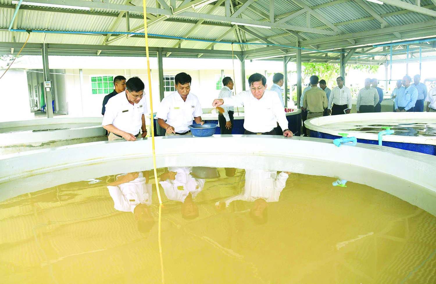 ယင်းနောက် နိုင်ငံတော်စီမံအုပ်ချုပ်ရေးကောင်စီဥက္ကဋ္ဌ နိုင်ငံတော်ဝန်ကြီးချုပ်သည် မွေးမြူရေးဇုန်အတွင်းရှိ ငါးသားဖောက်လုပ်ငန်းဆောင်ရွက်နေမှုနှင့် ငါးသားပေါက်မွေးမြူထားရှိမှု အခြေအနေများအား လှည့်လည်ကြည့်ရှုစစ်ဆေးပြီး တာဝန်ရှိသူများ၏ တင်ပြချက်များအပေါ် လိုအပ်သည်များ မှာကြားသည်။