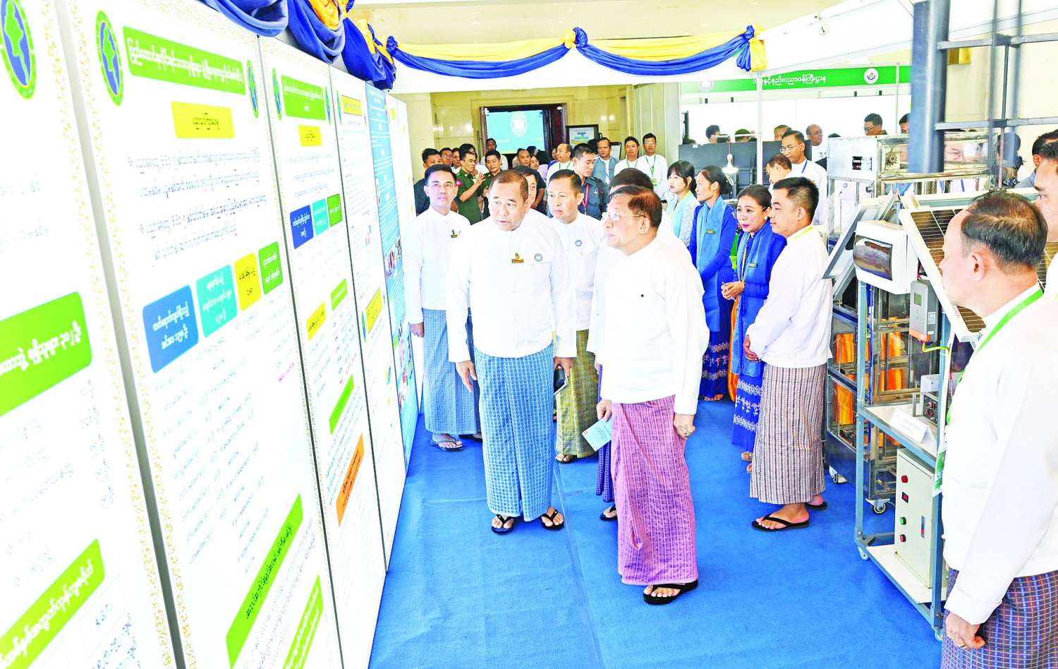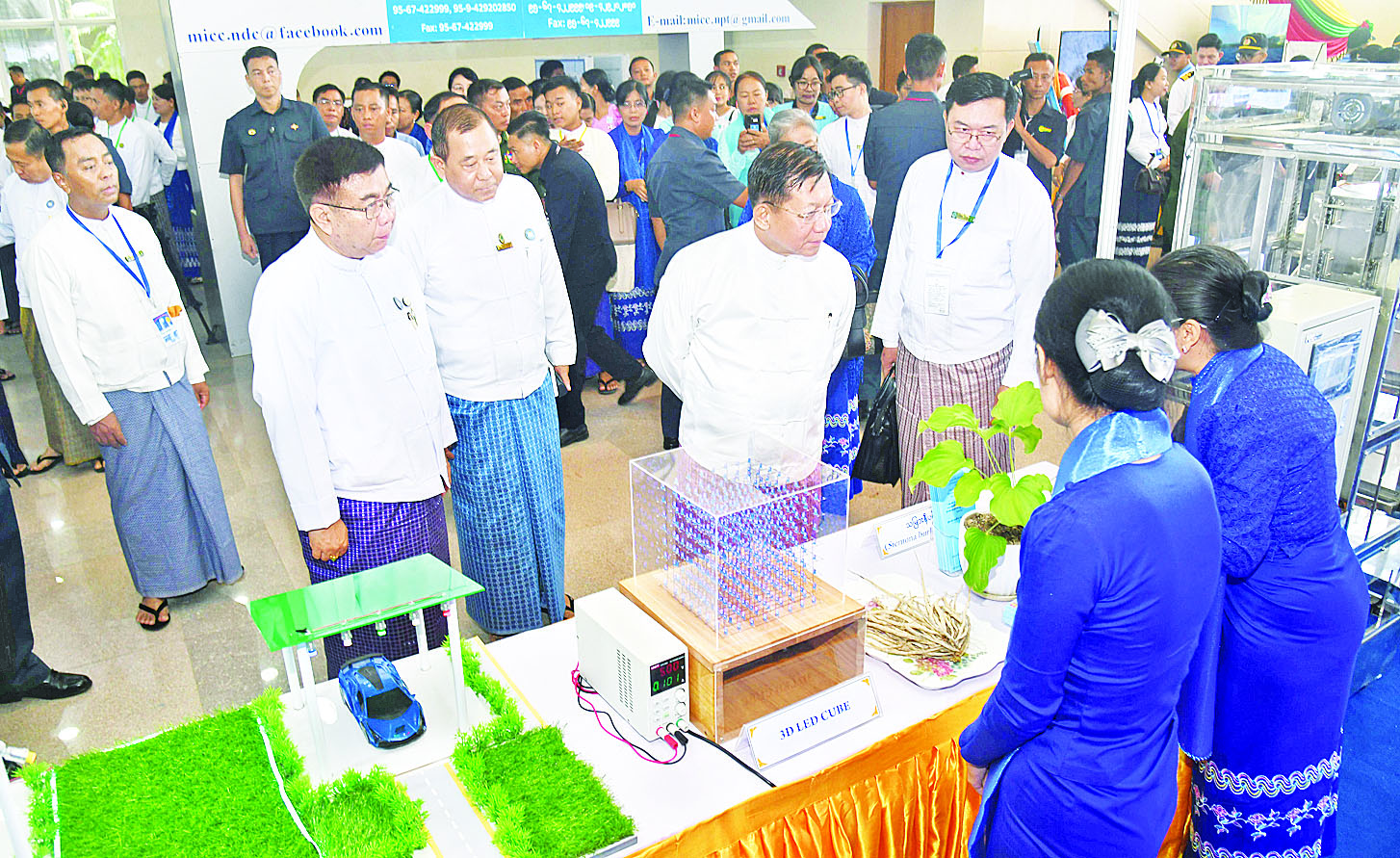 ထို့နောက် နိုင်ငံတော်စီမံအုပ်ချုပ်ရေးကောင်စီဥက္ကဋ္ဌ နိုင်ငံတော်ဝန်ကြီးချုပ်နှင့် အခမ်းအနားတက်ရောက်လာကြသူများသည် ခင်းကျင်းပြသထားသည့် မြန်မာနိုင်ငံလုံးဆိုင်ရာပညာရေး ညီလာခံ(၂၀၂၄) အထိမ်းအမှတ်ပြခန်းများအား ပြခန်းတစ်ခုချင်းစီအလိုက် စိတ်ပါဝင်စားစွာဖြင့် လိုက်လံကြည့်ရှုခဲ့ကြသည်။