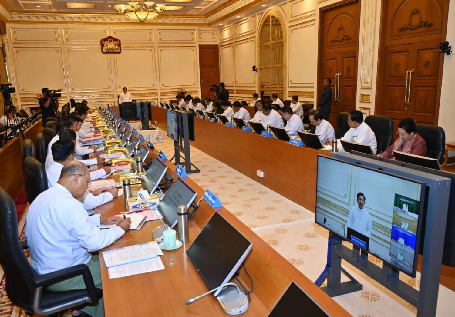 ယင်းနောက် အစည်းအဝေးသို့ တက်ရောက်လာကြသည့် ပြည်ထောင်စုဝန်ကြီးများက သက်ဆိုင်ရာကဏ္ဍအလိုက် ရှင်းလင်းတင်ပြကြသည်။