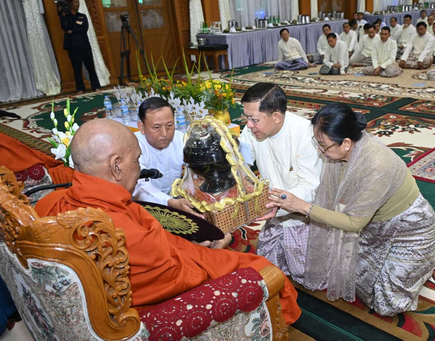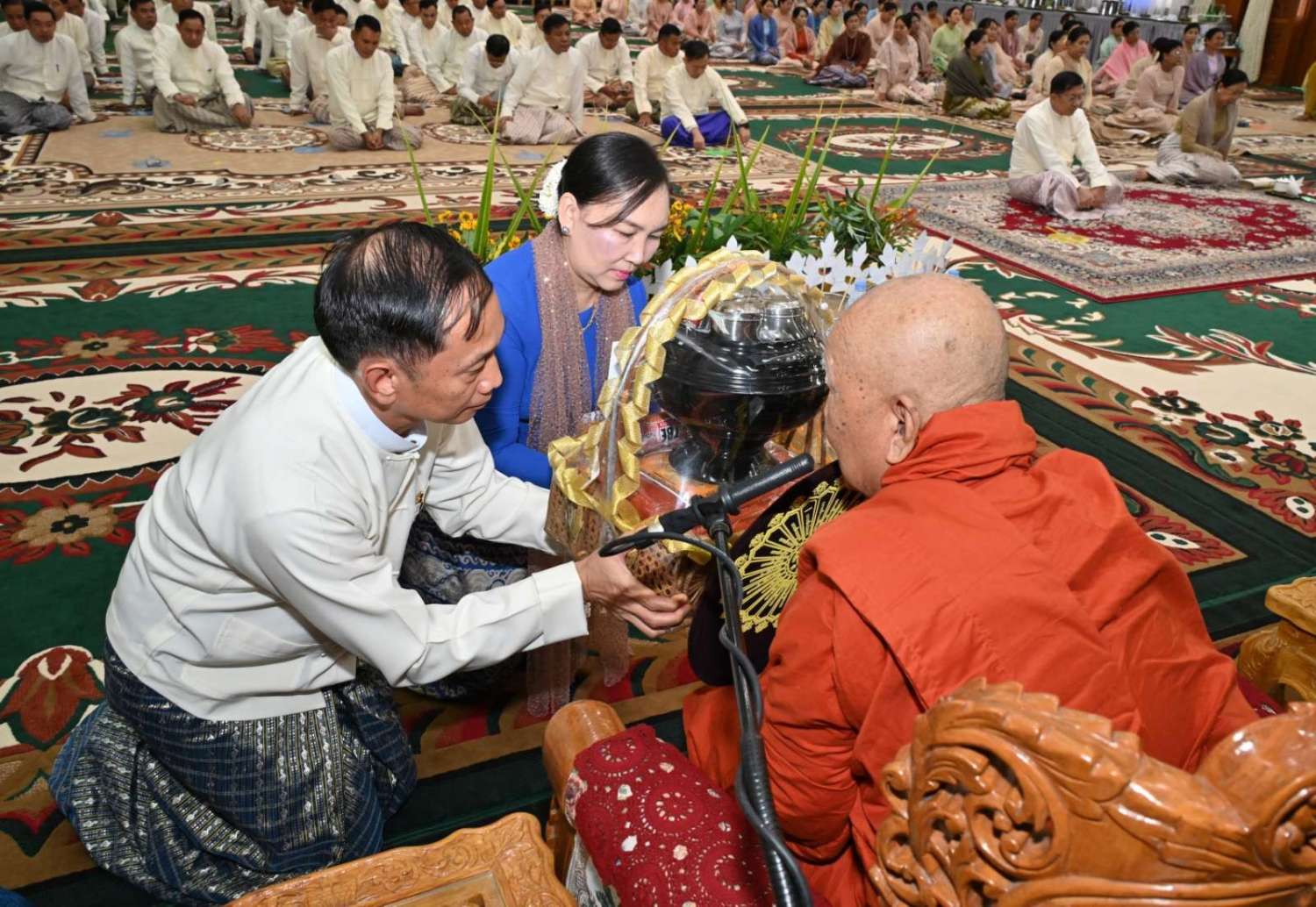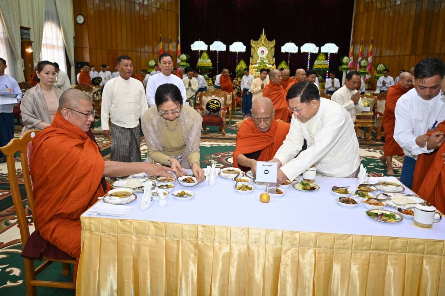 ၂၀၂၄ ခုနှစ်၊ ကာကွယ်ရေးဦးစီးချုပ်ရုံး (ကြည်း၊ ရေ၊ လေ) မိသားစုများ ဝါဆိုသင်္ကန်းဆက်ကပ်လှူဒါန်းပွဲ မဟာမင်္ဂလာအခမ်းအနားကို ယနေ့နံနက်ပိုင်းတွင် ကာကွယ်ရေးဦးစီးချုပ်ရုံး (ကြည်း)၊ အနော်ရထာခန်းမ၌ ကျင်းပပြုလုပ်ရာ နိုင်ငံတော်စီမံအုပ်ချုပ်ရေးကောင်စီဥက္ကဋ္ဌ တပ်မတော်ကာကွယ်ရေးဦးစီးချုပ် ဗိုလ်ချုပ်မှူးကြီး မင်းအောင်လှိုင်နှင့် ဇနီး ဒေါ်ကြူကြူလှတို့ တက်ရောက်ကြည်ညို၍ ဝါဆိုသင်္ကန်း၊ လှူဖွယ်ပစ္စည်းများနှင့် နေ့ဆွမ်းတို့ကို ဆက်ကပ်လှူဒါန်းသည်။