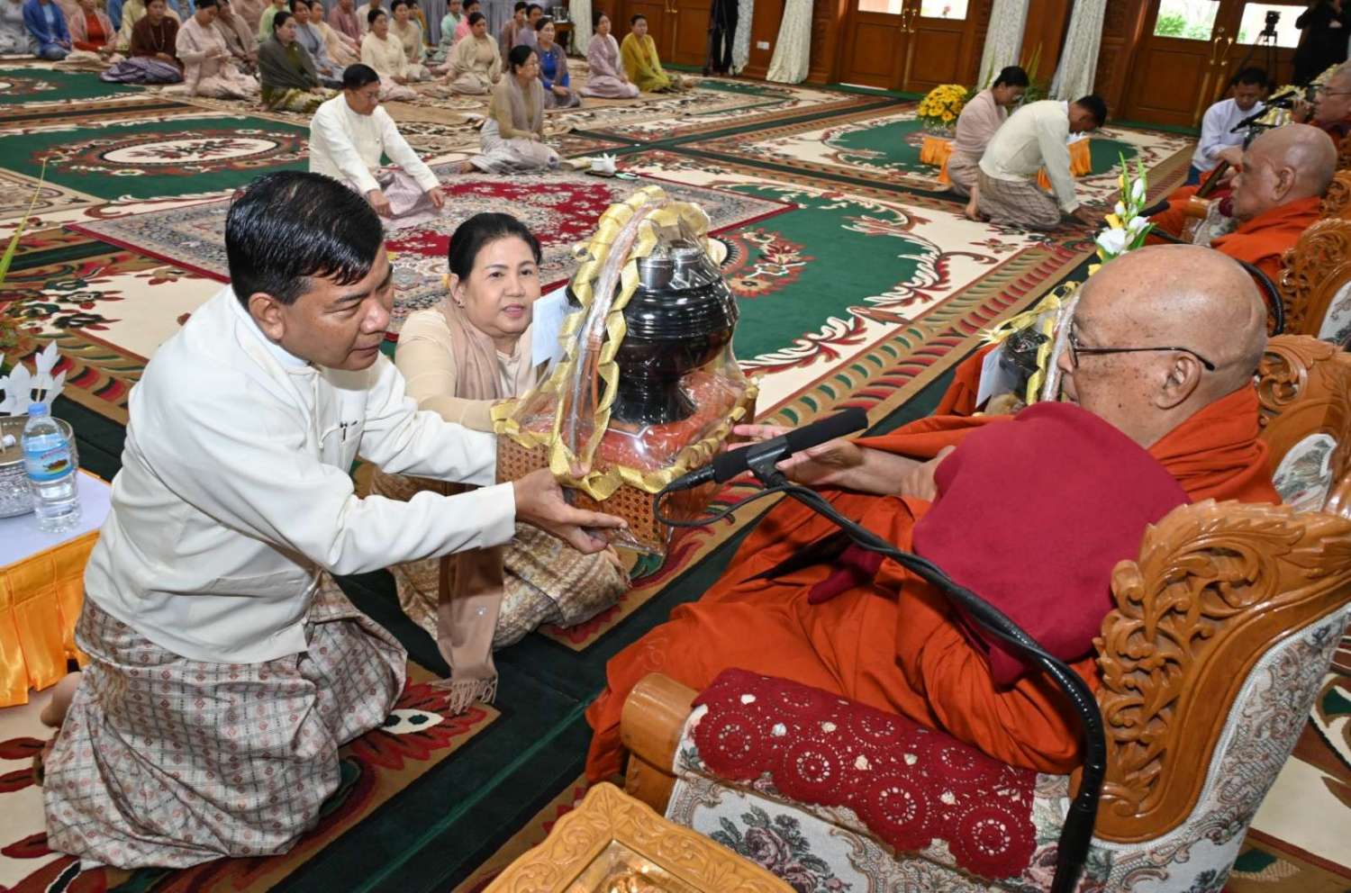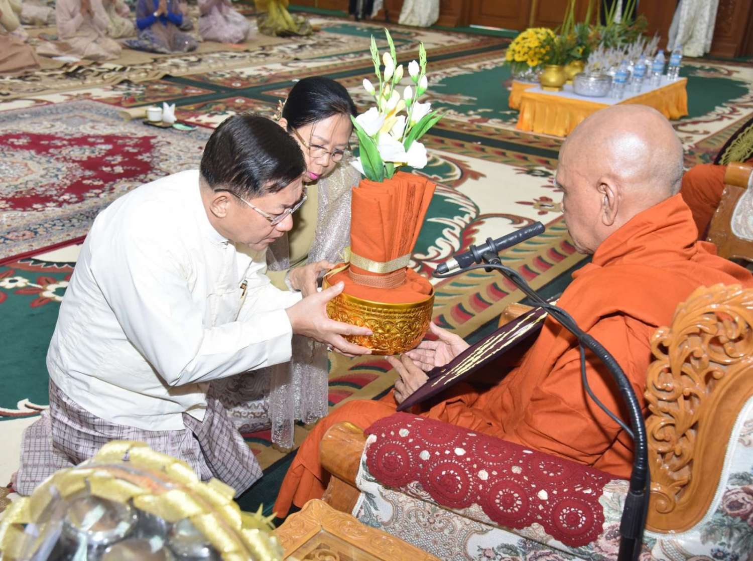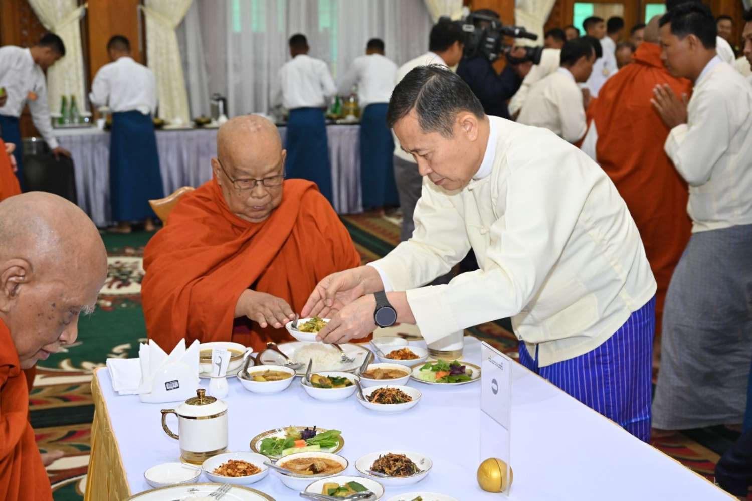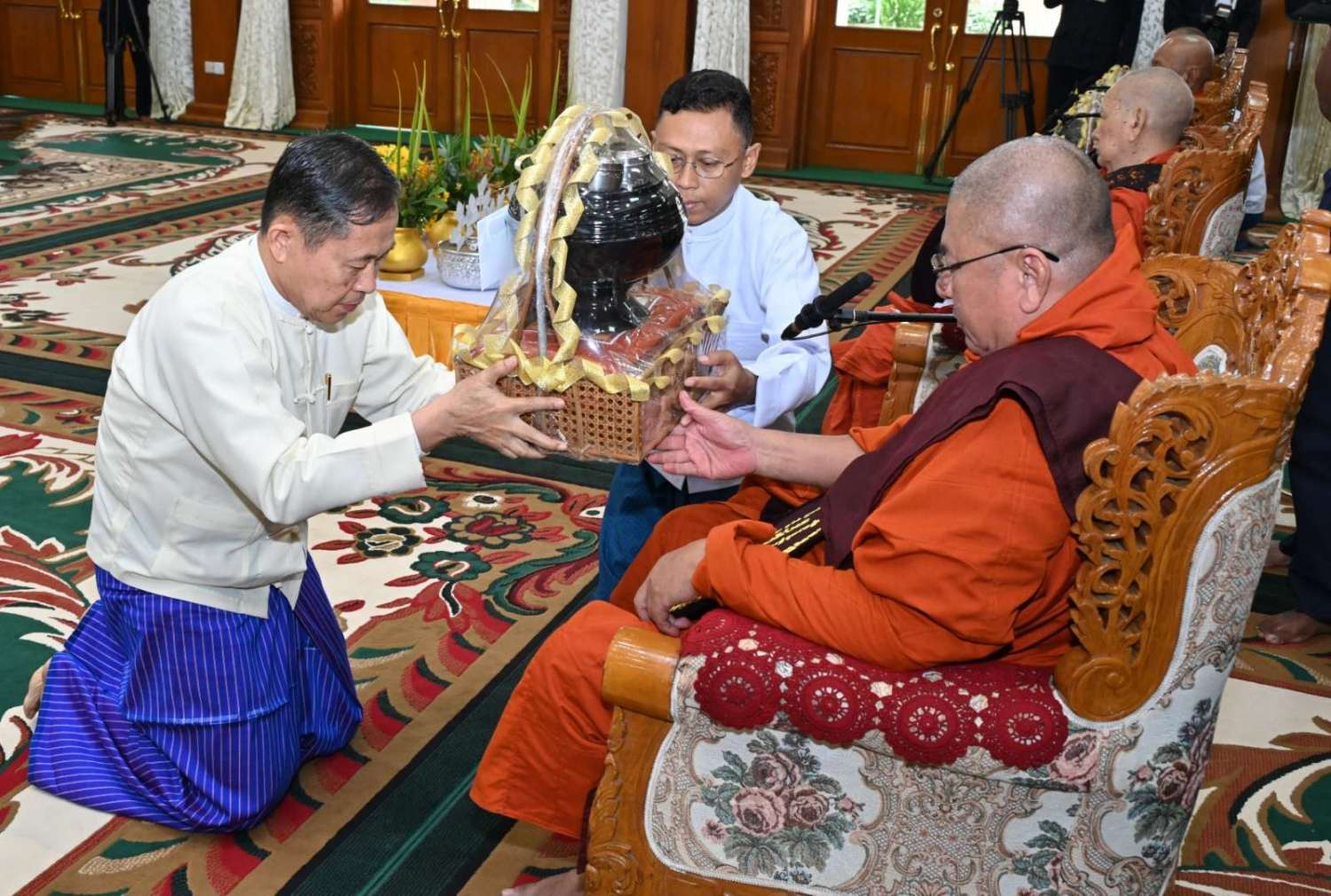 ၂၀၂၄ ခုနှစ်၊ ကာကွယ်ရေးဦးစီးချုပ်ရုံး (ကြည်း၊ ရေ၊ လေ) မိသားစုများ ဝါဆိုသင်္ကန်းဆက်ကပ်လှူဒါန်းပွဲ မဟာမင်္ဂလာအခမ်းအနားကို ယနေ့နံနက်ပိုင်းတွင် ကာကွယ်ရေးဦးစီးချုပ်ရုံး (ကြည်း)၊ အနော်ရထာခန်းမ၌ ကျင်းပပြုလုပ်ရာ နိုင်ငံတော်စီမံအုပ်ချုပ်ရေးကောင်စီဥက္ကဋ္ဌ တပ်မတော်ကာကွယ်ရေးဦးစီးချုပ် ဗိုလ်ချုပ်မှူးကြီး မင်းအောင်လှိုင်နှင့် ဇနီး ဒေါ်ကြူကြူလှတို့ တက်ရောက်ကြည်ညို၍ ဝါဆိုသင်္ကန်း၊ လှူဖွယ်ပစ္စည်းများနှင့် နေ့ဆွမ်းတို့ကို ဆက်ကပ်လှူဒါန်းသည်။