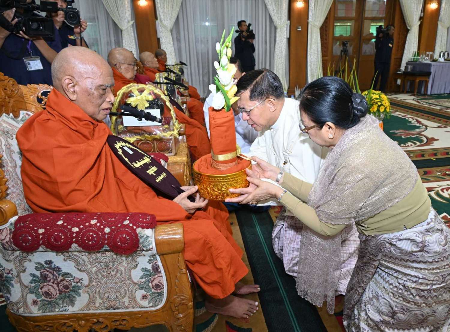 ထို့နောက် နိုင်ငံတော်စီမံအုပ်ချုပ်ရေးကောင်စီဥက္ကဋ္ဌ တပ်မတော်ကာကွယ်ရေးဦးစီးချုပ်နှင့် ဇနီးတို့က နိုင်ငံတော်သံဃမဟာနာယကအဖွဲ့ဥက္ကဋ္ဌ သန်လျင်မင်းကျောင်းဆရာတော်ကြီးထံ ဝါဆိုသင်္ကန်းနှင့် လှူဖွယ်ပစ္စည်းများကို ဆက်ကပ်လှူဒါန်းသည်။